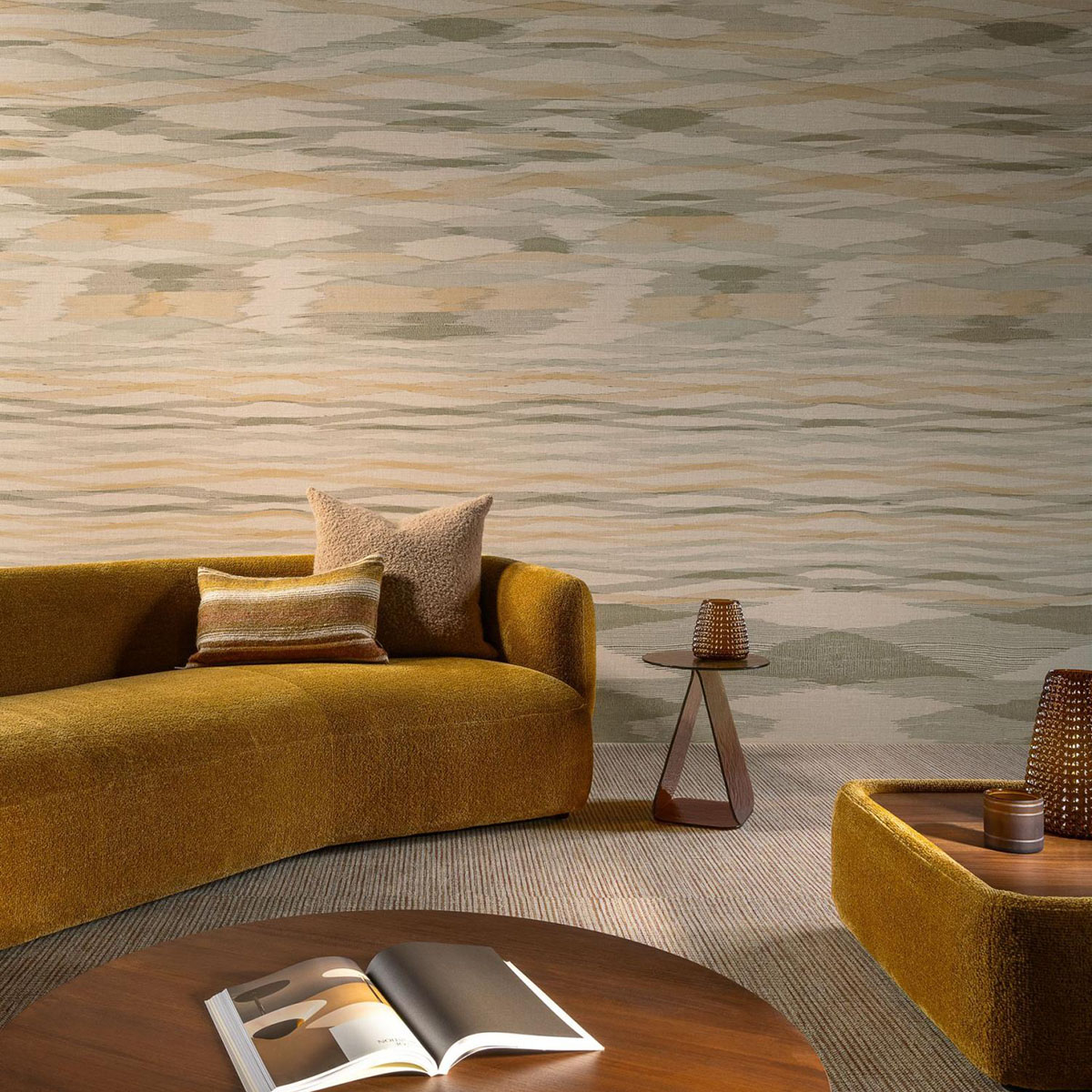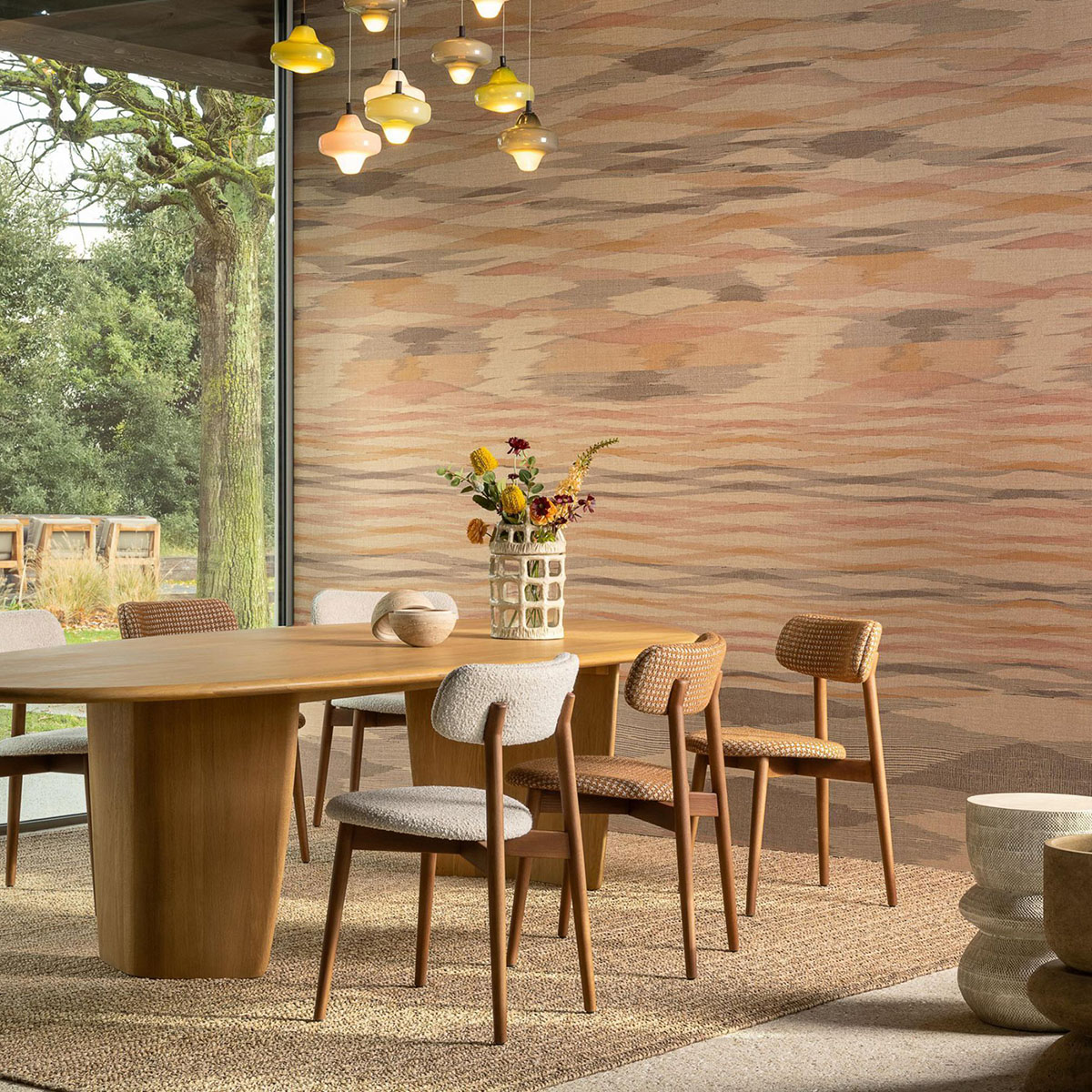 Anyone visiting India cannot fail to be captivated by the abundance of colourful shawls. They inspired Kashmir: a panoramic design printed on a vinyl base that carries the texture of evenly woven linen.