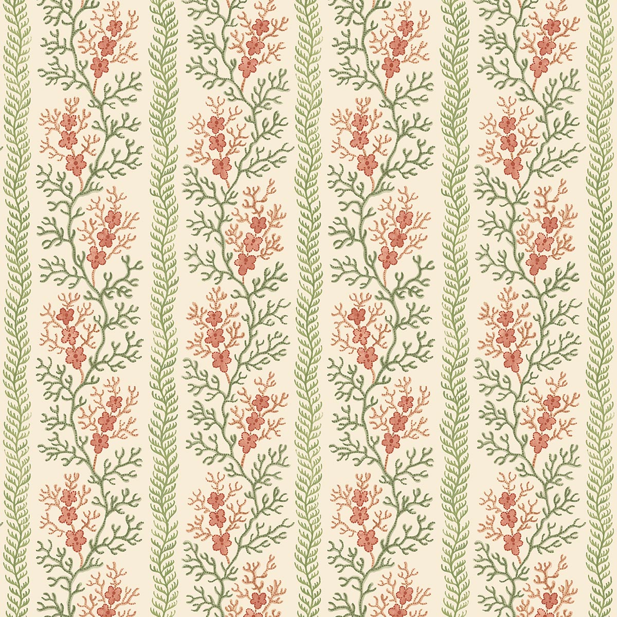 Charmingly informal just like its namesake, ‘Symington’ features a delicate leafy coral stripe adorned with pretty miniature flowers. Taken from a small watercolour design which is dated from 1760-1790, the design would have been used to print onto lightweight cotton or muslin for ladies clothes.