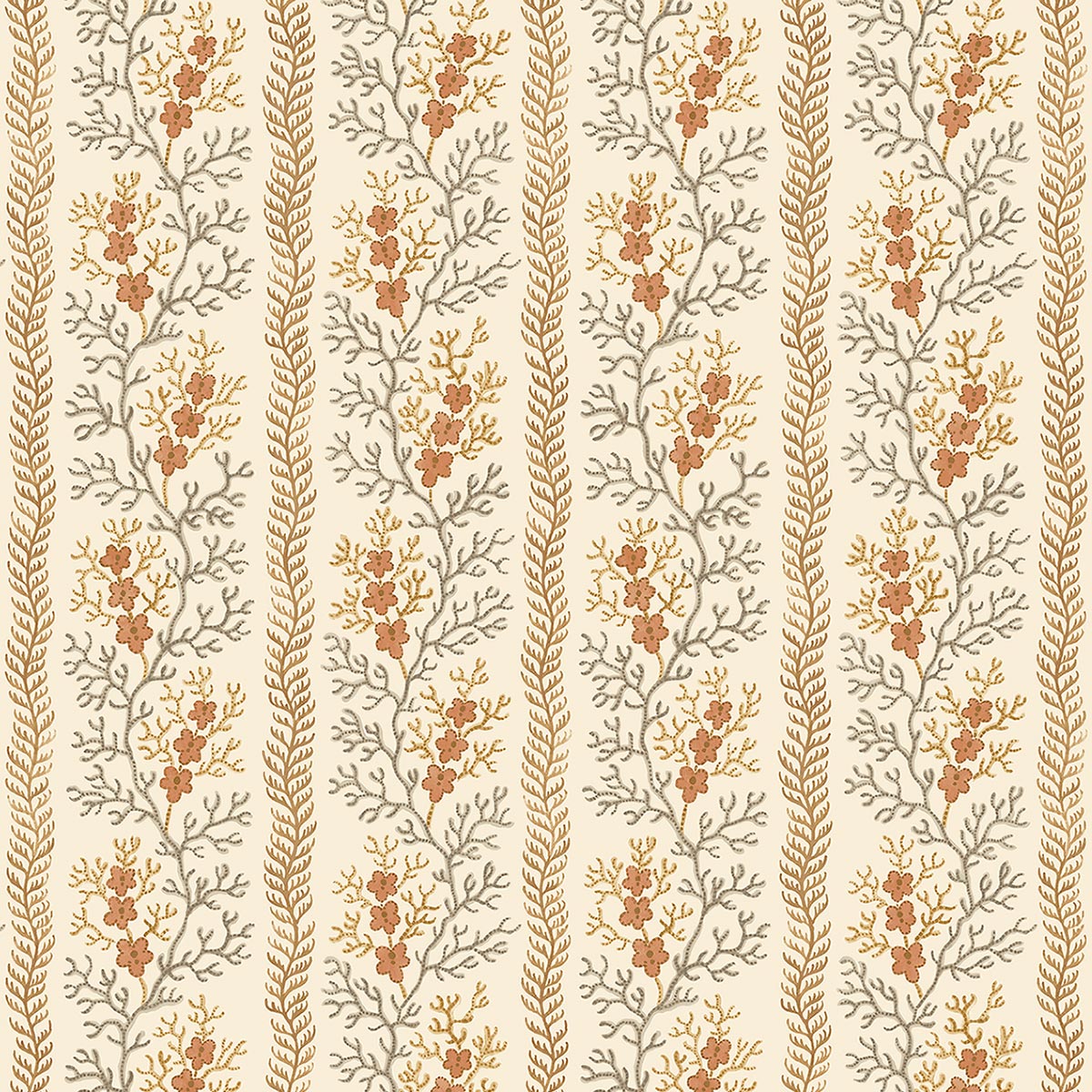 Charmingly informal just like its namesake, ‘Symington’ features a delicate leafy coral stripe adorned with pretty miniature flowers. Taken from a small watercolour design which is dated from 1760-1790, the design would have been used to print onto lightweight cotton or muslin for ladies clothes.