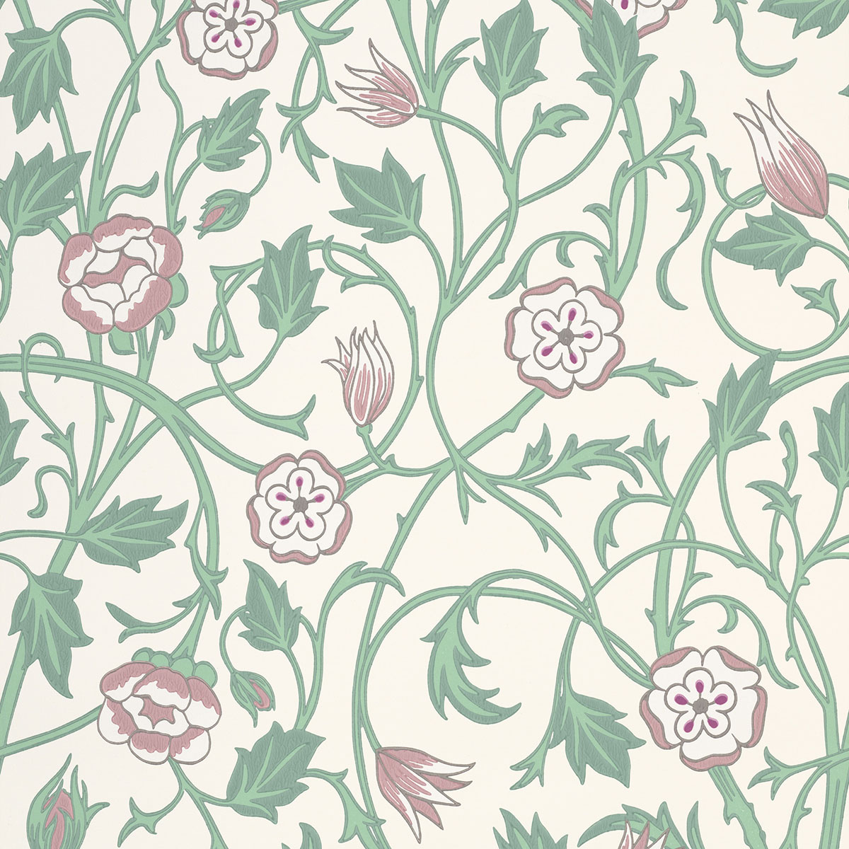 May Morris, dochter van de beroemde Arts & Crafts-pionier, dichter en ontwerper William Morris, erfde niet alleen het bedrijf en een deel van de status van haar vader, maar was zelf een uiterst begaafd en invloedrijk lid van de Arts & Crafts-beweging. Geboren in 1862 in Red House in Zuid-Londen - het ouderlijk huis van de familie Morris en een iconisch middelpunt van William’s ontwerp- en architectuurerfgoed - verwierf May vooral bekendheid met haar verfijnde borduur- en sieradenontwerpen. In 1907 richtte zij mede de Women’s Guild of Arts op, die vrouwelijke kunstenaars en ontwerpers een professioneel platform bood in een tijd waarin de kunstwereld hoofdzakelijk door mannen werd gedomineerd. Het sierlijke dessin ‘May’s Tulip’ is geïnspireerd op een prachtig laat-19e-eeuws weefsel met weelderige tulpen, destijds verwerkt in panelen als scheiding tussen ruimten. Dit behang toont een vloeiend netwerk van verstrengelde ranken en sierlijke stelen, doorspekt met gestileerde bloemen en ontluikende knoppen die samen een ritmisch, harmonieus patroon vormen.