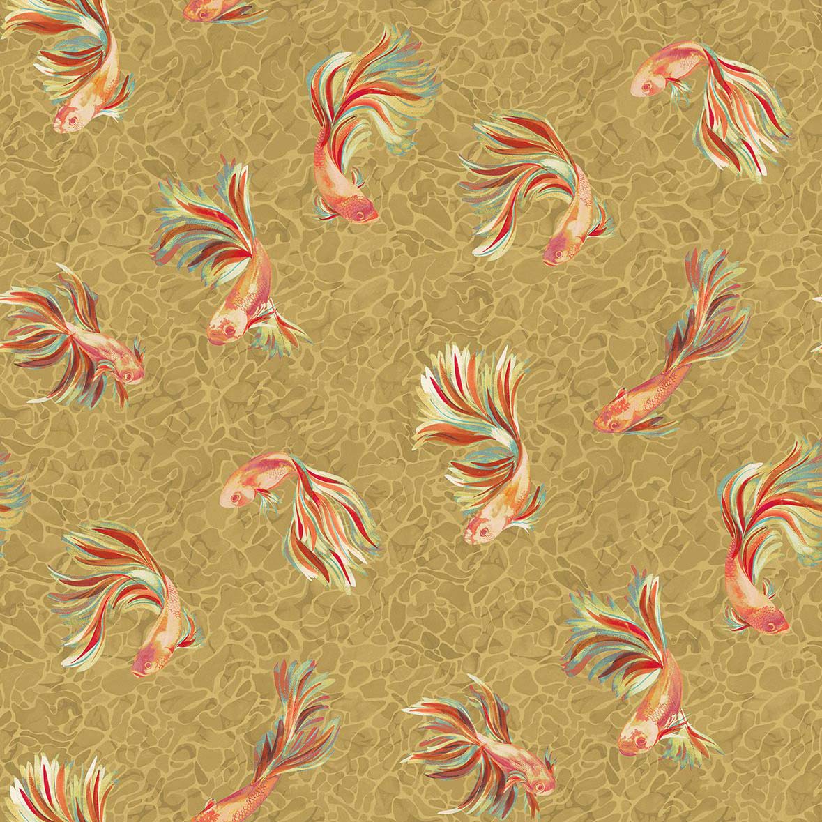An elegant ribbon-tailed fish swimming through swirling water pools, with one option printed on a metallic gold ground.