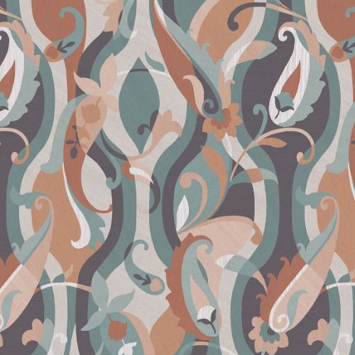 A paisley design with a contemporary character, reminiscent of decorative marquetry and inlaid artistry.