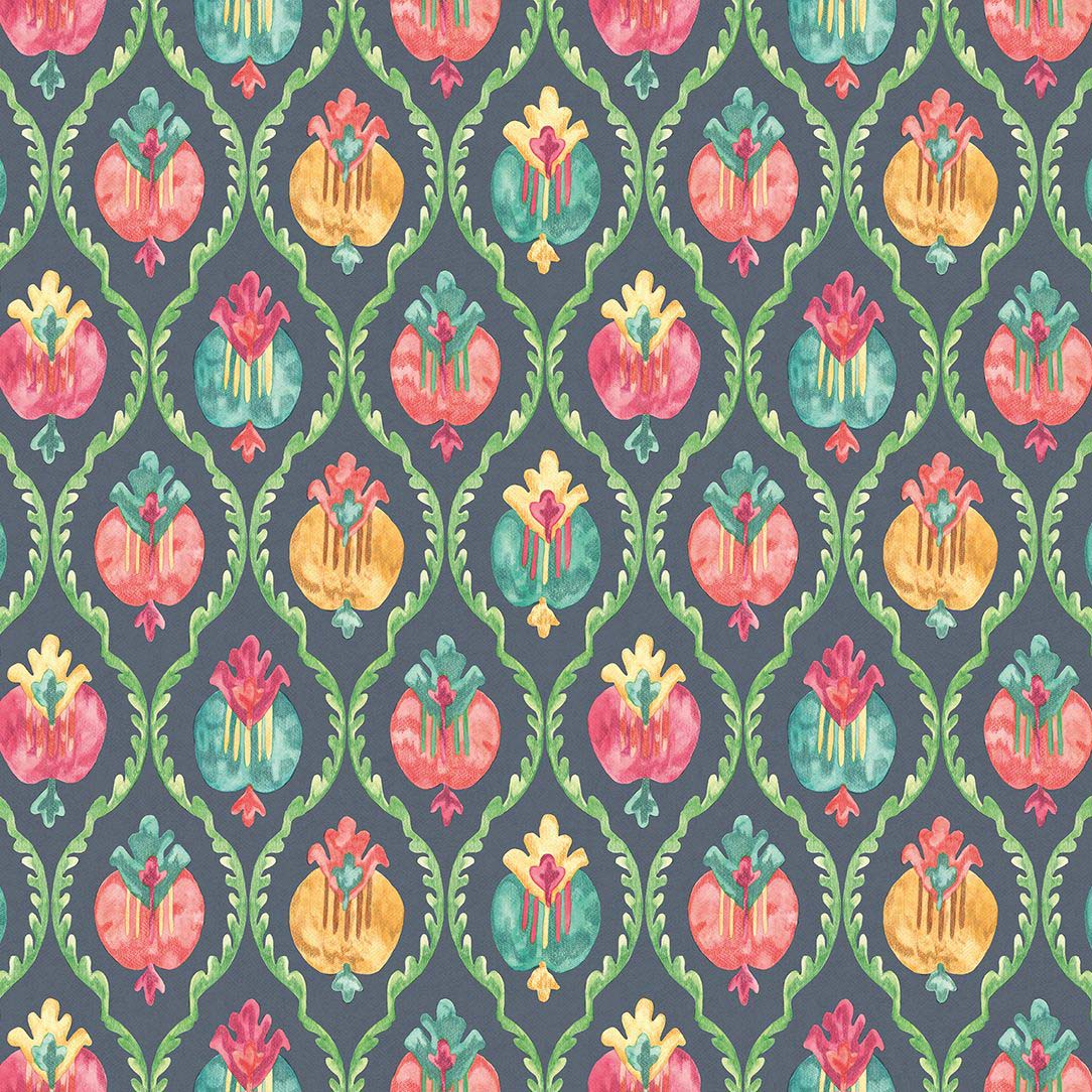 An ogee trellis enclosing stylised pomegranates in jewel-like colours, with one colourway on a metallic gold ground.