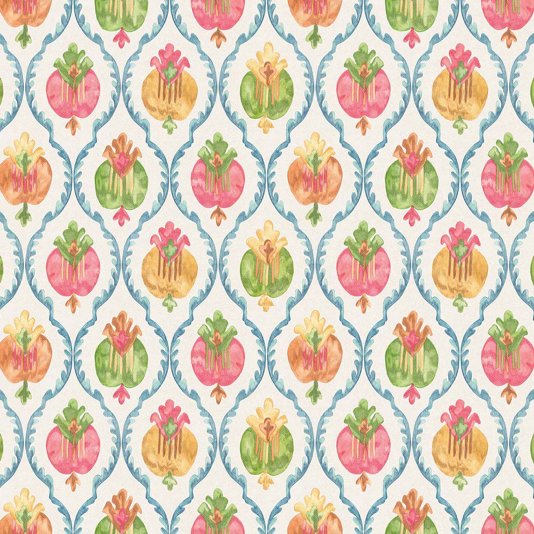 An ogee trellis enclosing stylised pomegranates in jewel-like colours, with one colourway on a metallic gold ground.
