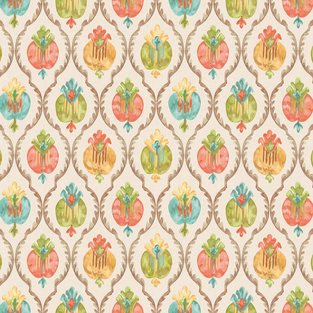 An ogee trellis enclosing stylised pomegranates in jewel-like colours, with one colourway on a metallic gold ground.