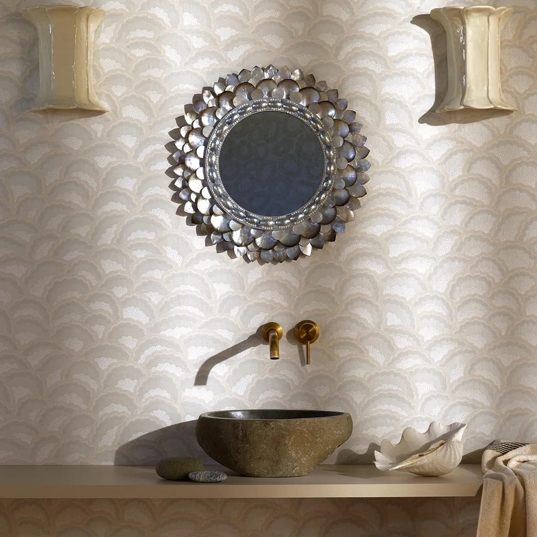 Timeless pattern with refined colours and printed using a traditional printing technique with a hand-painted effect, Arlesienne from the archives of Maison Pierre Frey recalls the quilted petticoats of Arles city.