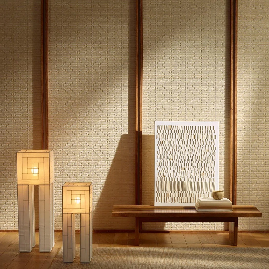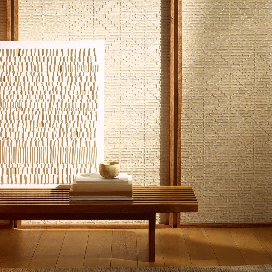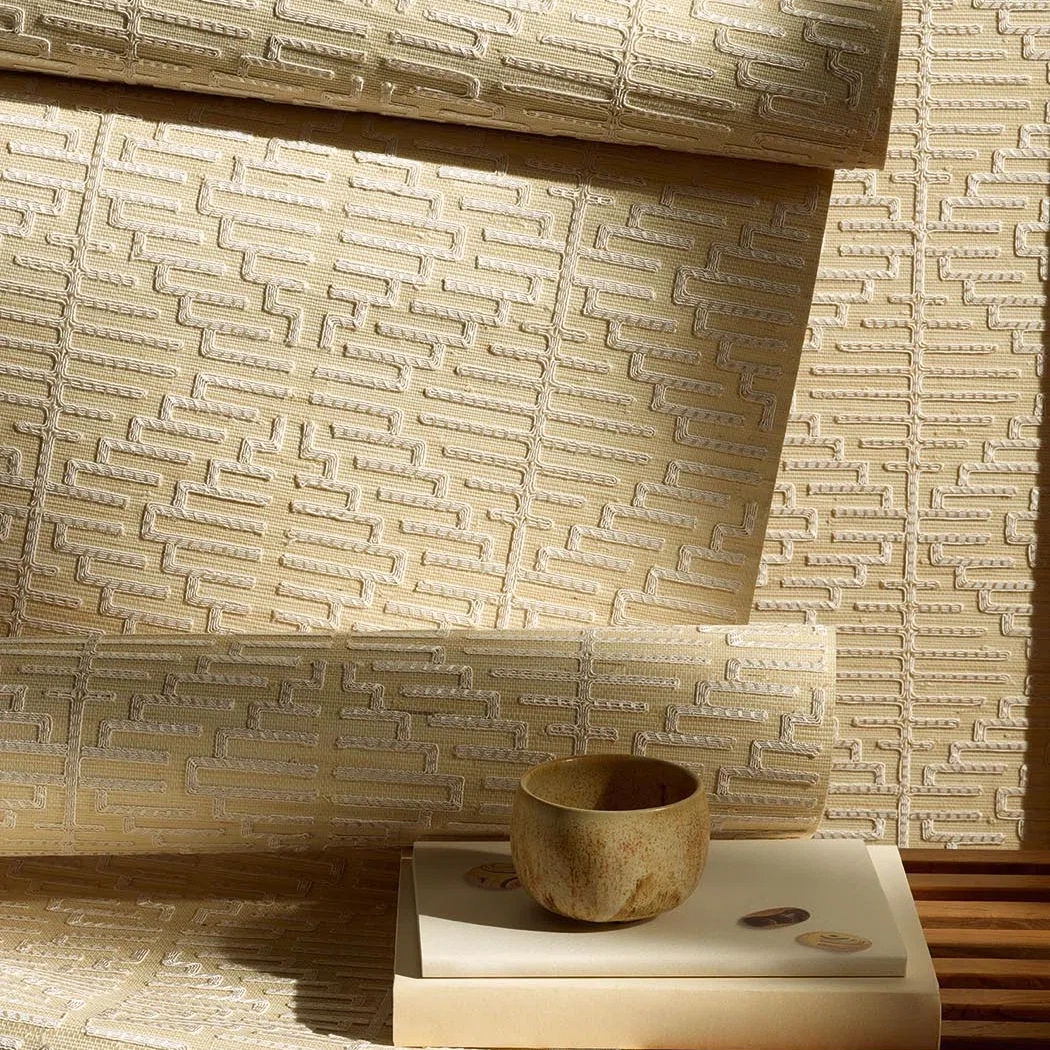 Magnificent pearlescent geometric embroidery on a sisal background laminated on non-woven fabric. Like a jewel, it gives the wall an exceptional look.