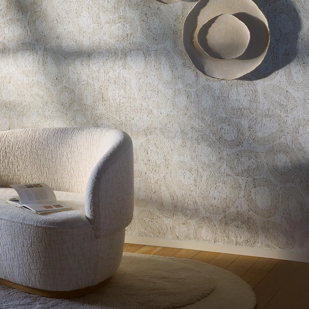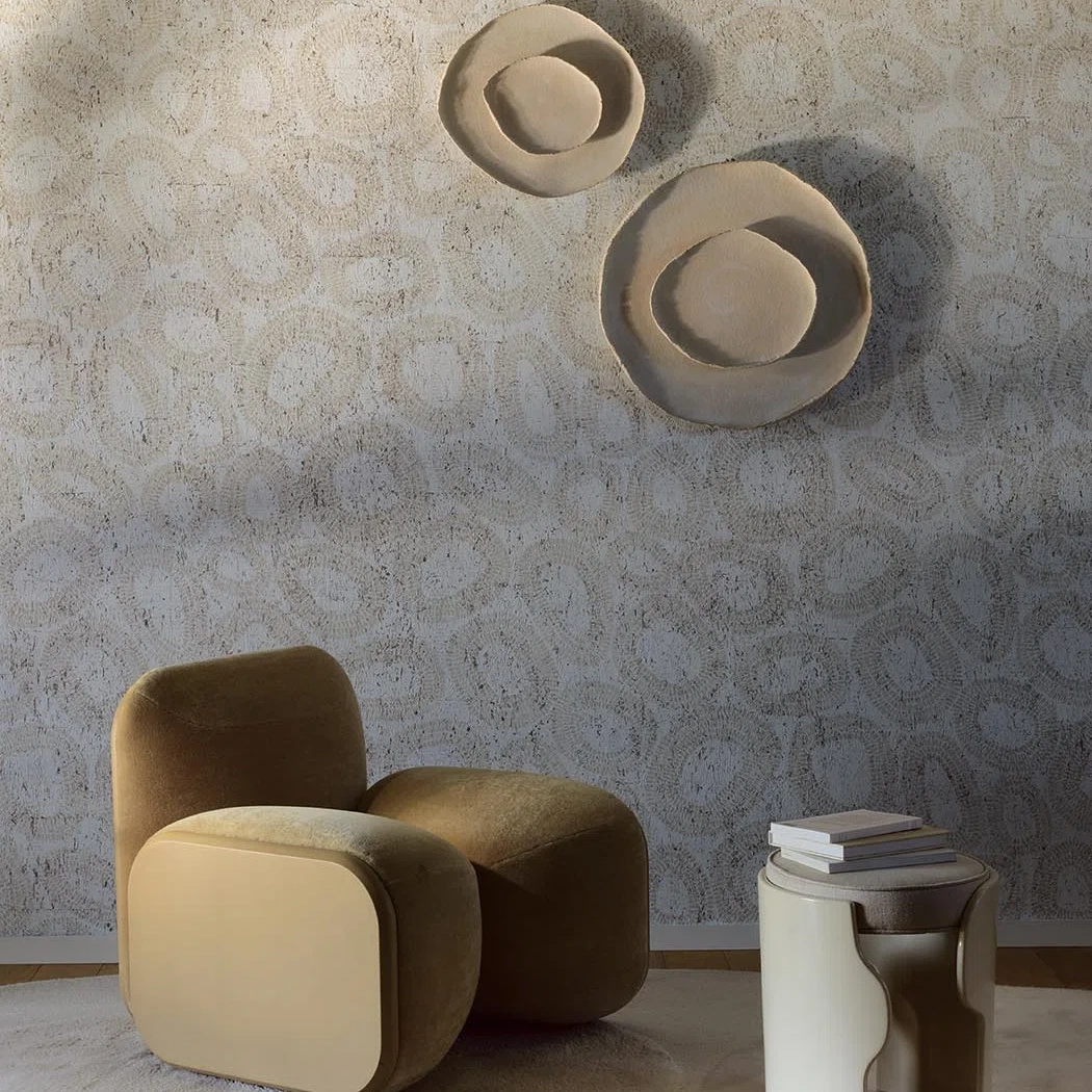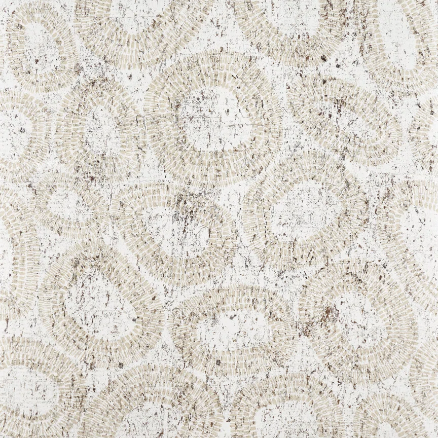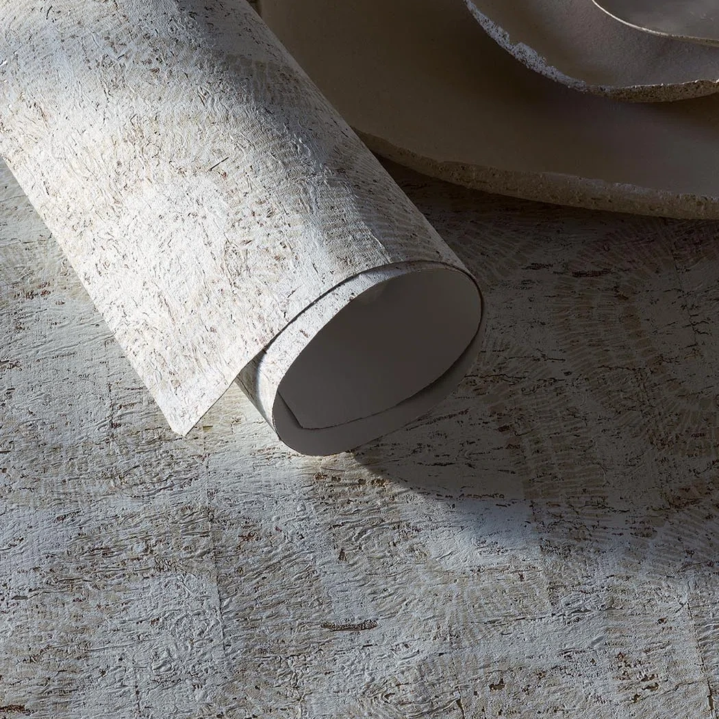 This graphic and mineral pattern is printed on bleached cork, subtly enhanced with metallic reflections.