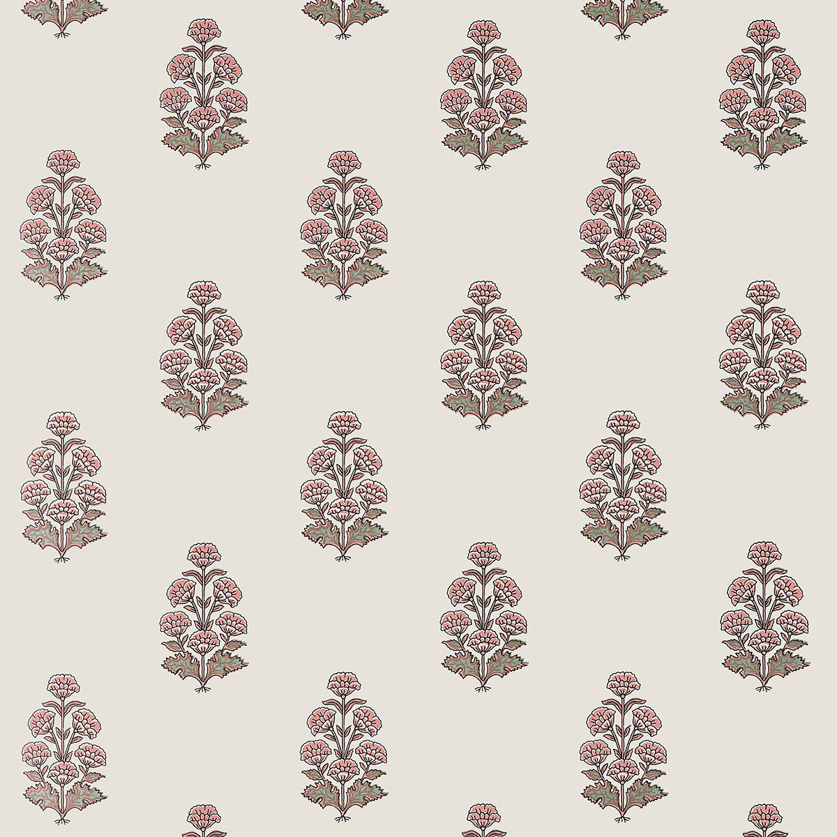 The open, small-scale design of Audrey is a great complement to the dense, allover patterns of the Boxwood collection. The Indienne block print design features little carnation bouquets in five colorways including blush, grey and beige.