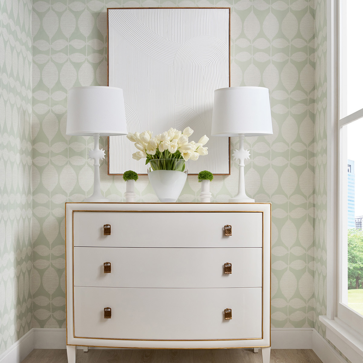 Lola features a large-scale organic leaf design, exuding a softness with its curved lines. Lola's playfully sophisticated pattern exhibits movement and texture in the ink from its surface printing method.