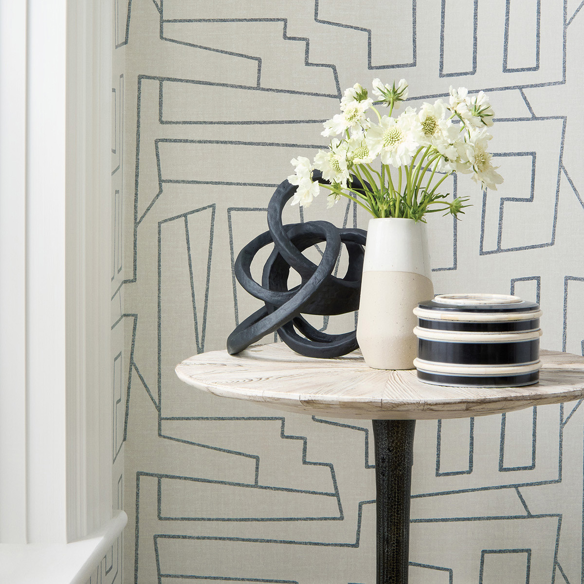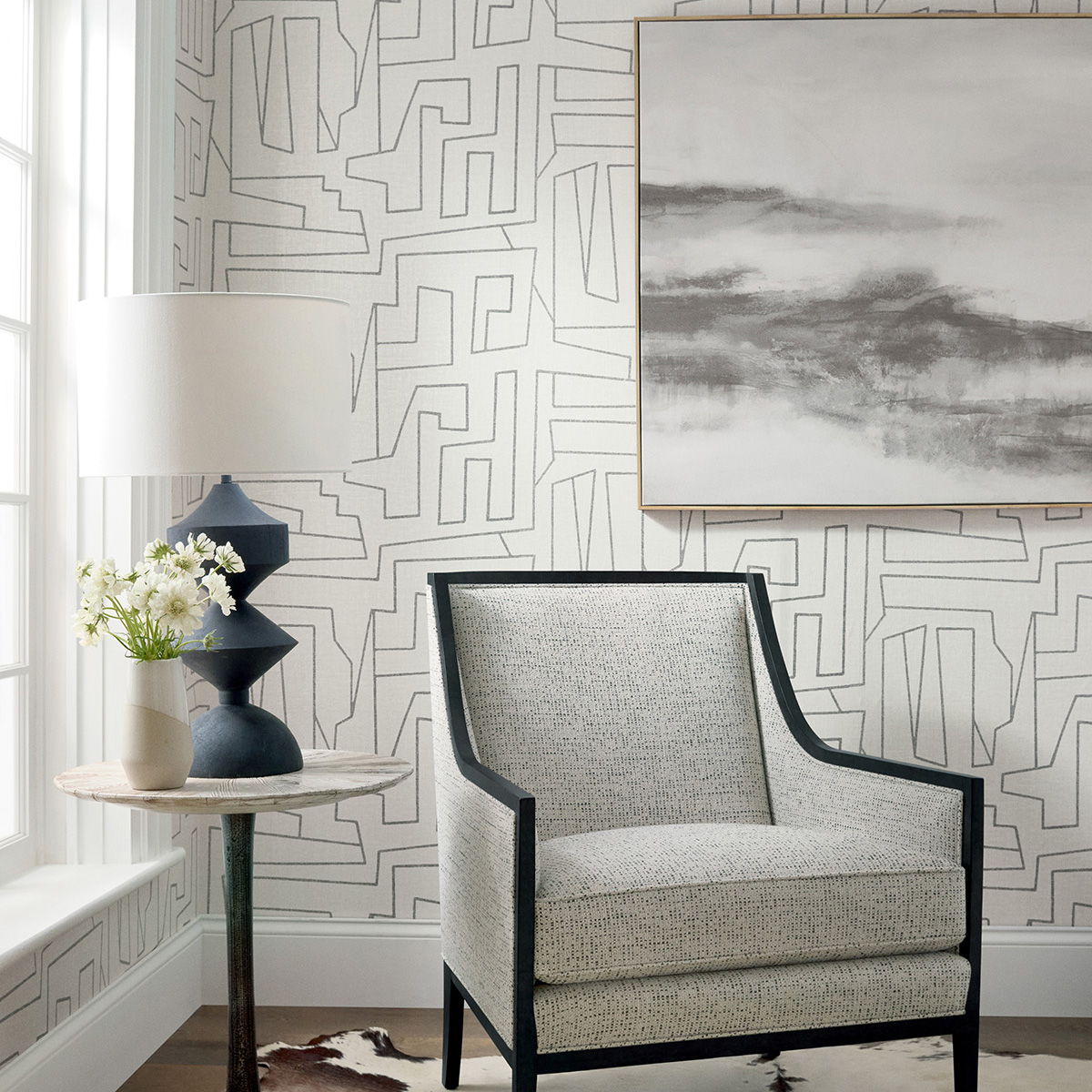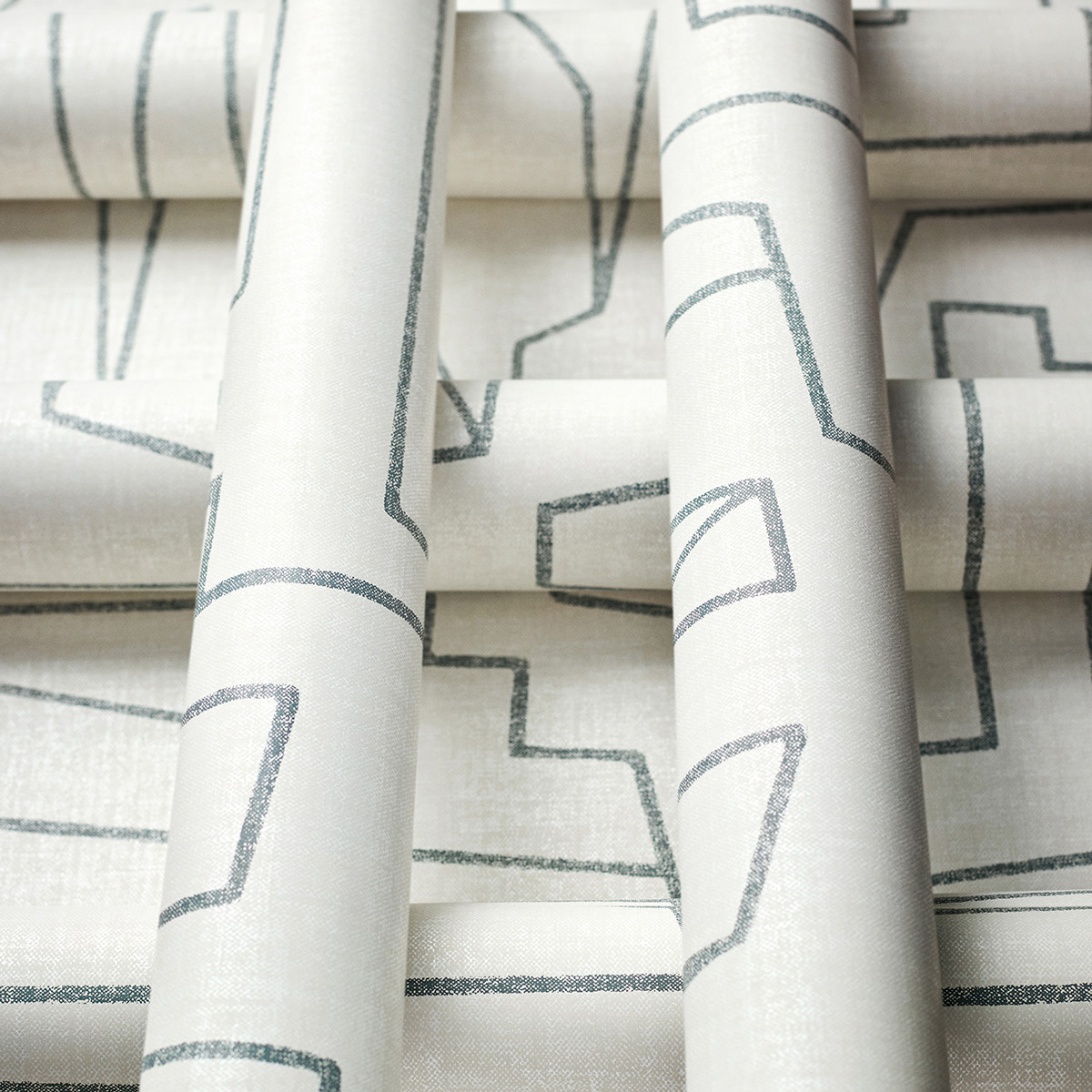 Thibaut's Matrix wallcovering features textured graphic lines on a simulated fabric backdrop. Seen in sophisticated neutrals, teal for a dose of drama, or black and white for a time-honored look.