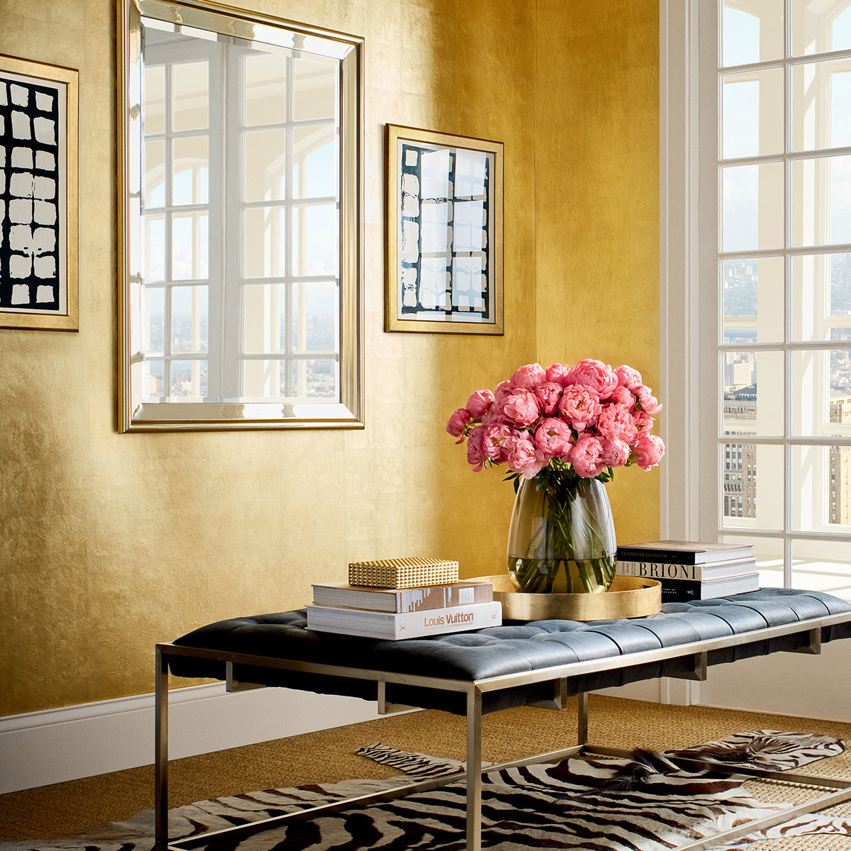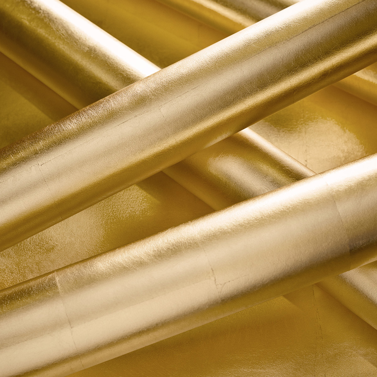Thibaut's specialty Metal Leaf wallcovering is made of delicate squares of gold, pewter, or silver, resembling pieces of foil. It is bold and impactful on your walls, or glamorous and eye-catching on a ceiling.