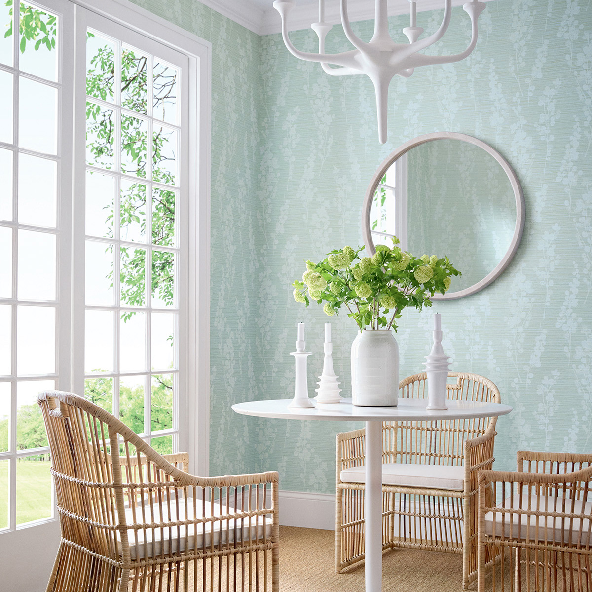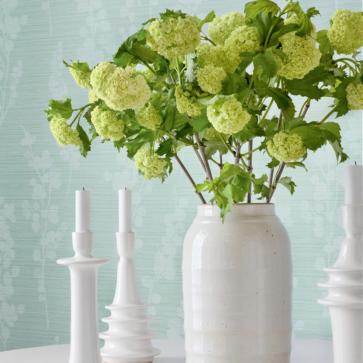 Spring Blooms features a subtle floral pattern of sprigs and berries atop a simulated grasscloth background. The embossed texture gives the look and feel of natural grasscloth while being a performance-grade wallcovering, great for high-traffic rooms.