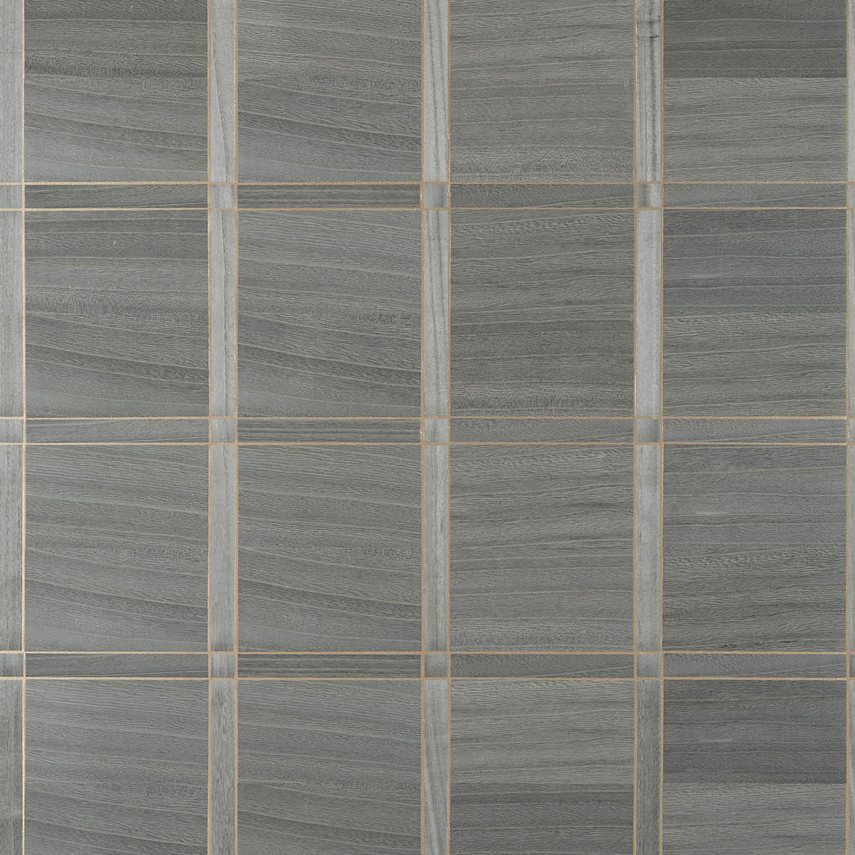 Natural elements and controlled design meet in Thibaut's Wood Panel wallcovering. Hand-assembled pieces of wood veneer are positioned on a metallic ground to make an interesting line-work pattern.