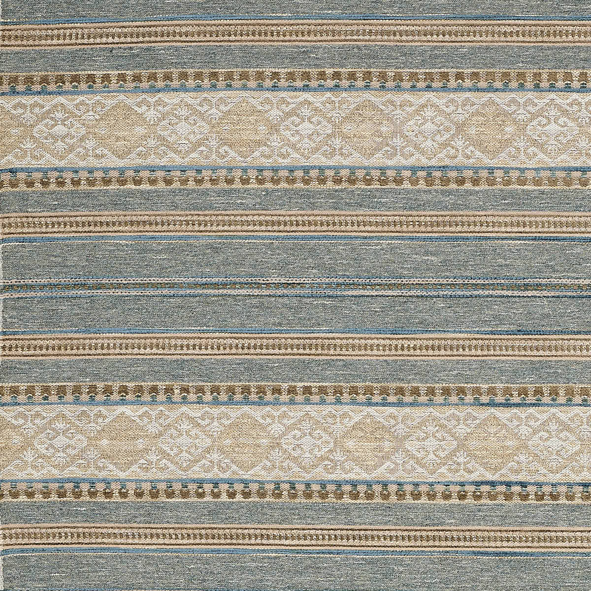 Inspired by antique kilims, this richly patterned woven stripe combines a variety of contrasting textured yarns to create dynamic surface interest. The muted patterned stripe, derived from one of our trims, is complemented by narrower bands featuring intricate motifs and chenille detailing. A marled yarn is used for the ground, adding depth and enhancing the layered, artisanal character of the design.