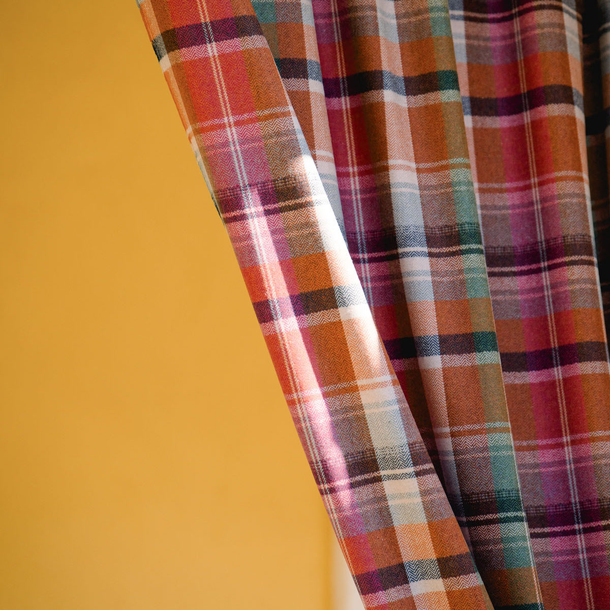 Born from the gardens and cellars of rural Saxon villages, Kerschdorf Plaid belongs to a way of living shaped by harvest and preservation. Its overlapping stripes recall textiles folded beside jars of fruit and root vegetables stored for winter, coloured in leafy greens, dark plums, pumpkins, and orchard produce. The rustic plaid pattern reflects a rich Transylvanian domestic world, absorbed by the passing of the seasons. Available in two grounded backgrounds, Foliage and Carrot.