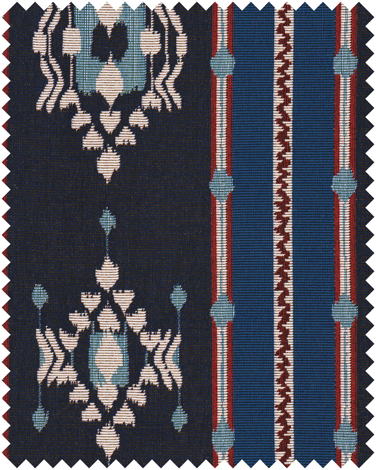 Revealing the majesty of ancestral sovereignty, King's Ikat honors motifs once reserved for textiles of status and symbolism. A batik-inspired ornamental striped band defines the composition, exuding authority against a midnight blue ground. Steeped in the language of nobility, the woven pattern recalls time-honored textiles, ornaments etched with echoes of heritage and threads that bear both weight and grace. Threads of deep indigo and muted cobalt intertwine with ornamental bands, their subtle irregularities and layered tones reminiscent of hand-dyed ikats once treasured in aristocratic halls, asserting everlasting prestige.
