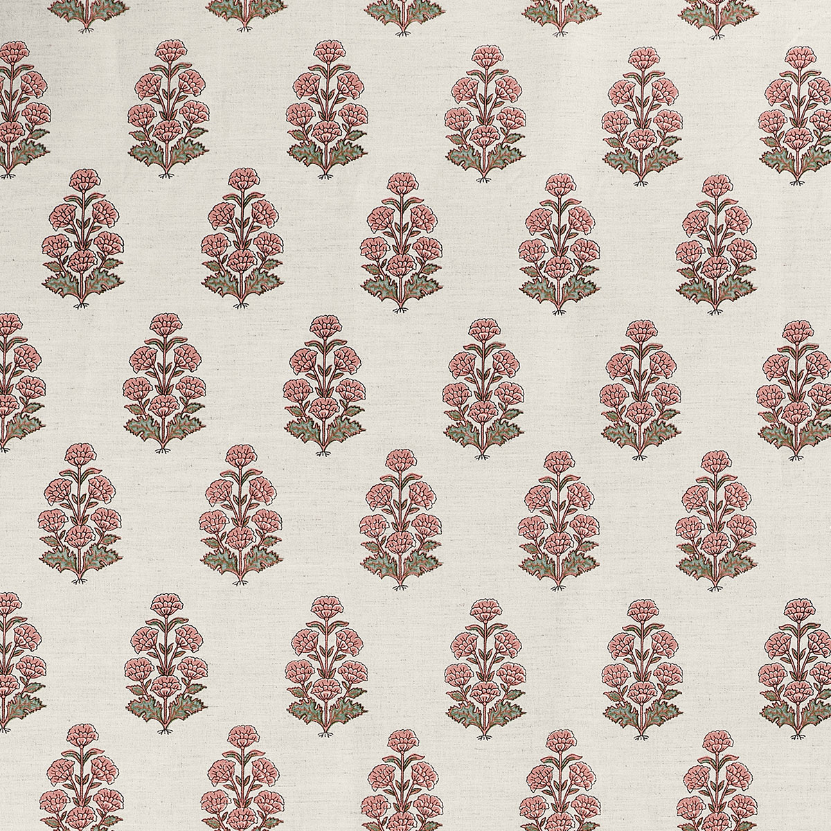 The open, small-scale design of Audrey is a great complement to the dense, allover patterns of the Boxwood collection. The Indienne block print design features little carnation bouquets in five colorways including blush, grey and beige.