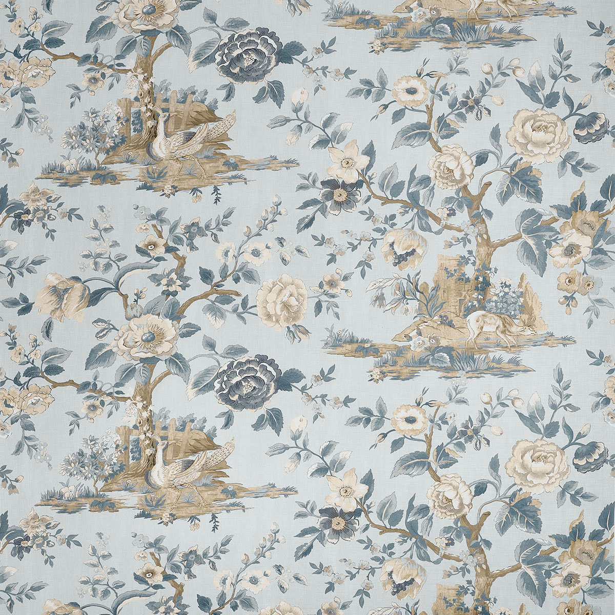 Capturing scenes from an English forest, this print was taken from an 1800s document. Deer pausing to drink from a pond and colorful pheasant set against large flowering trees, reimagined with new colors. The wallcovering and coordinating fabric comes in traditional olive green and cranberry to monochromatic beige and grey.
