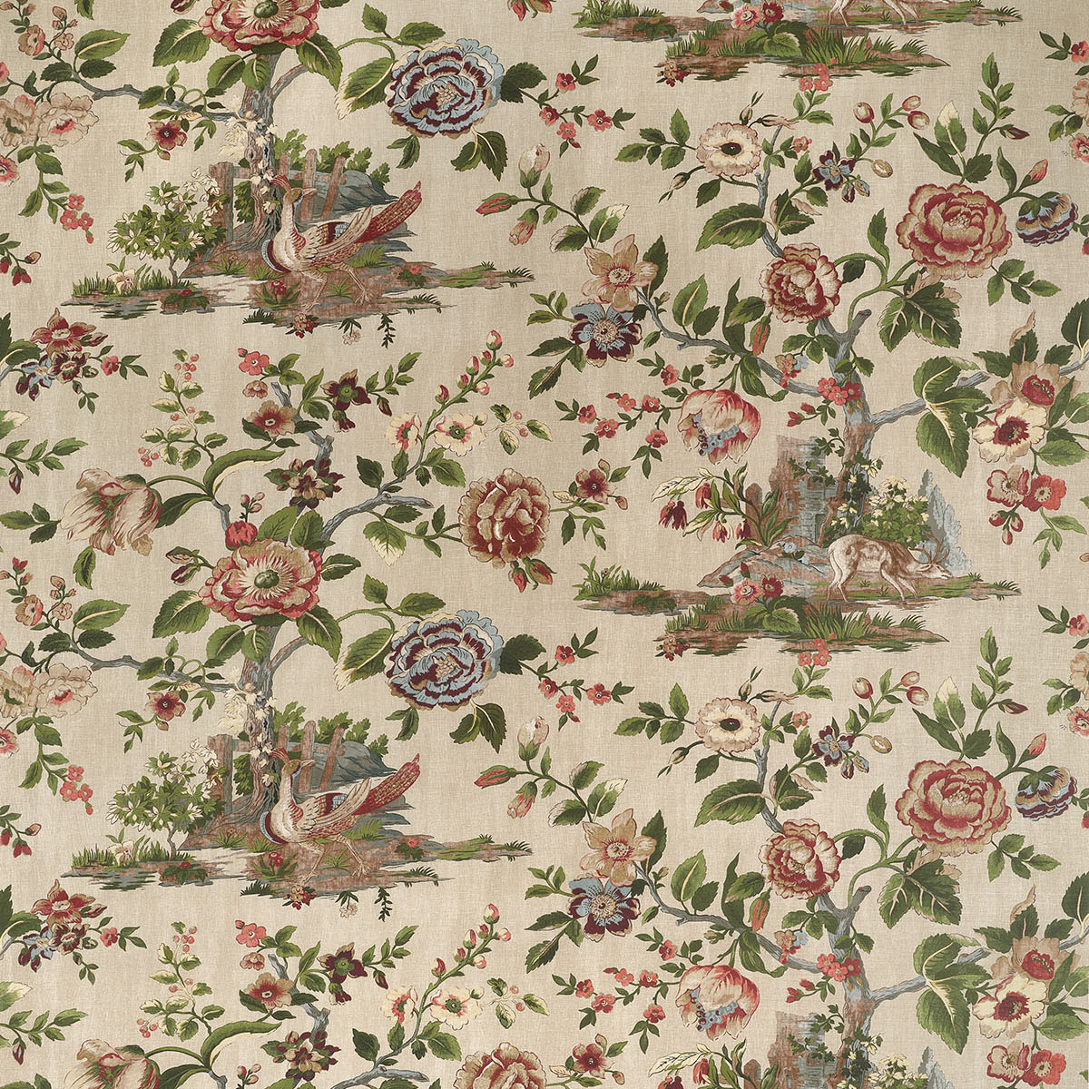 Capturing scenes from an English forest, this print was taken from an 1800s document. Deer pausing to drink from a pond and colorful pheasant set against large flowering trees, reimagined with new colors. The wallcovering and coordinating fabric comes in traditional olive green and cranberry to monochromatic beige and grey.