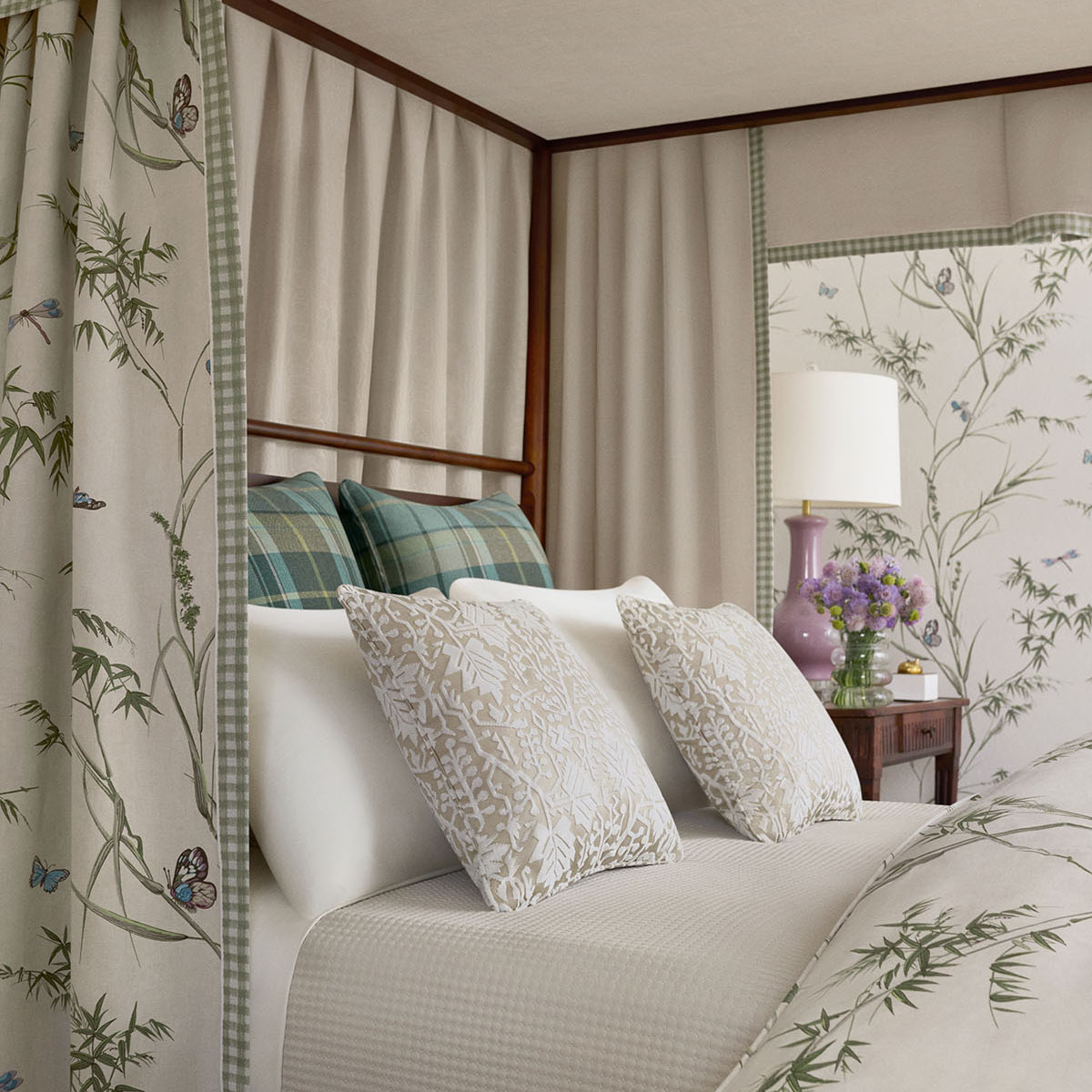 An open and elegant design, Virginia features an airy meadow scene of wild grasses, dragonflies and butterflies. Small touches of color are subtly incorporated in the insects. The small-scale design, offered in five colorways, makes it an easy and universal option as a wallcovering or fabric.
