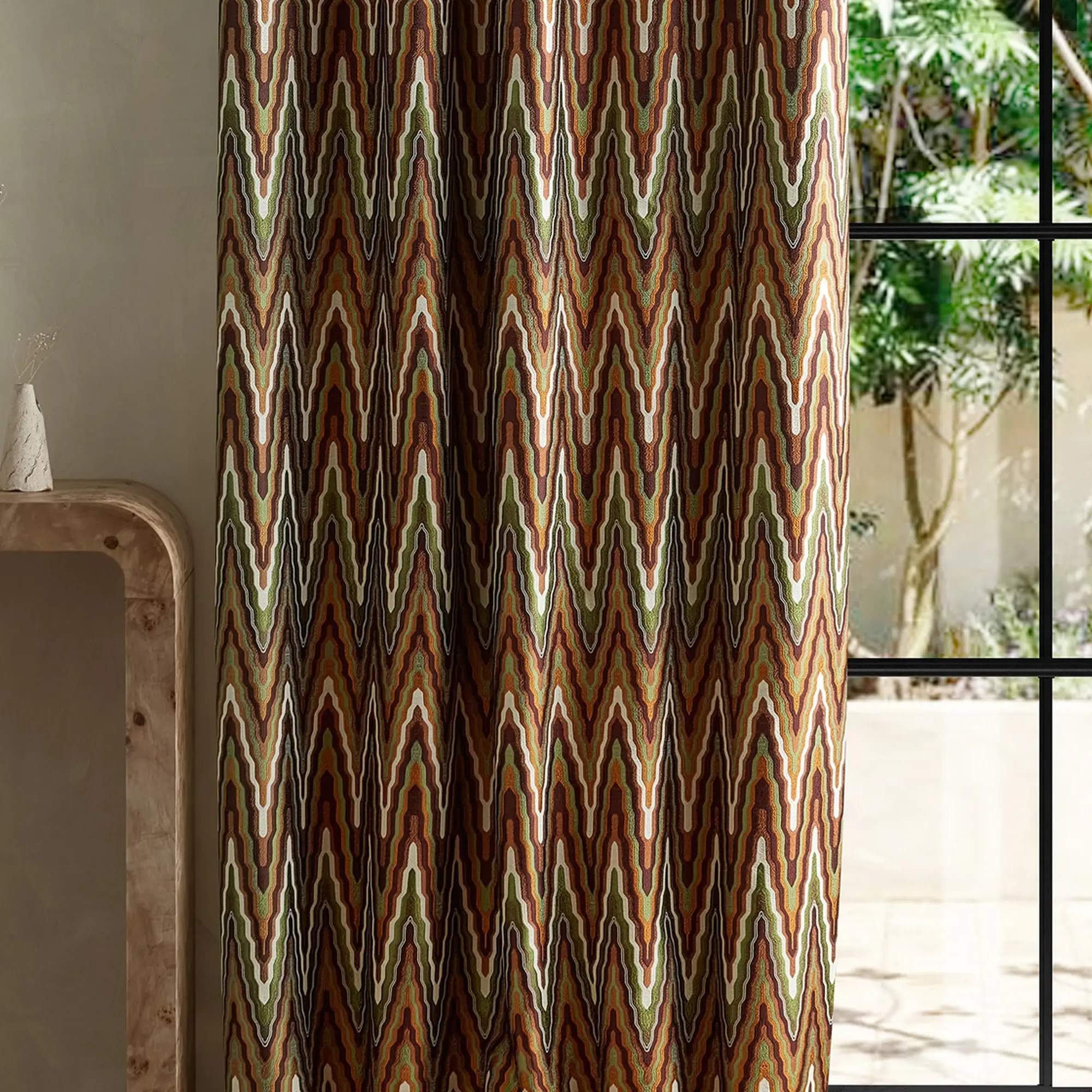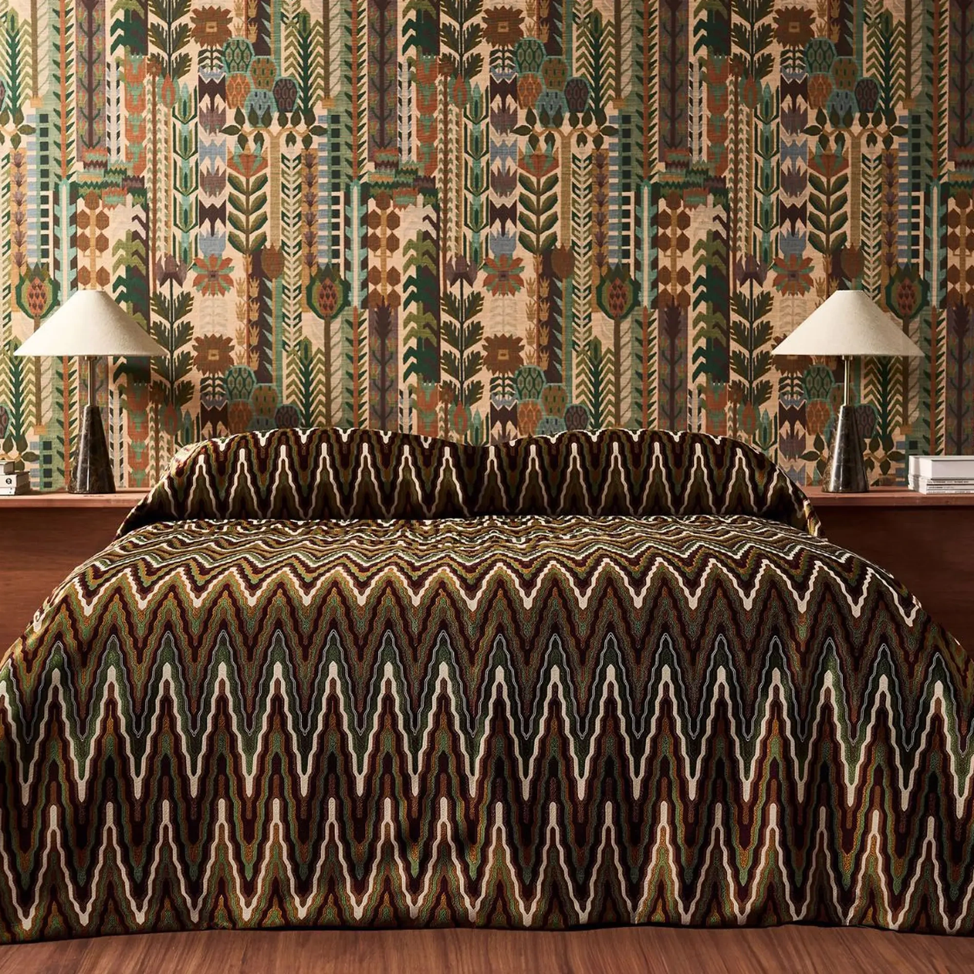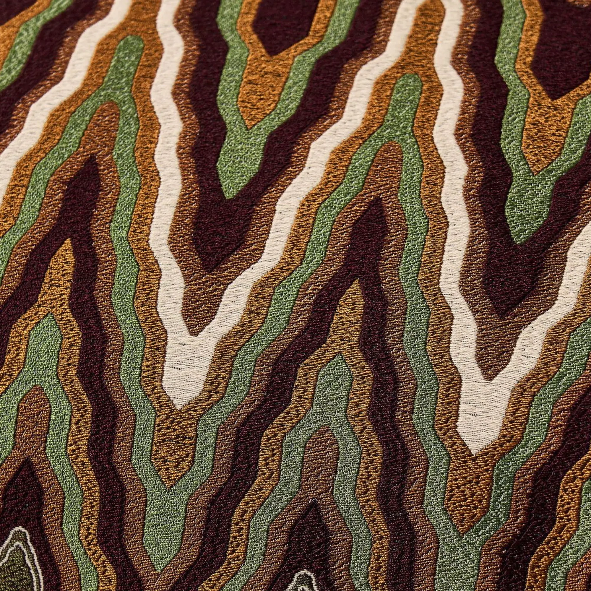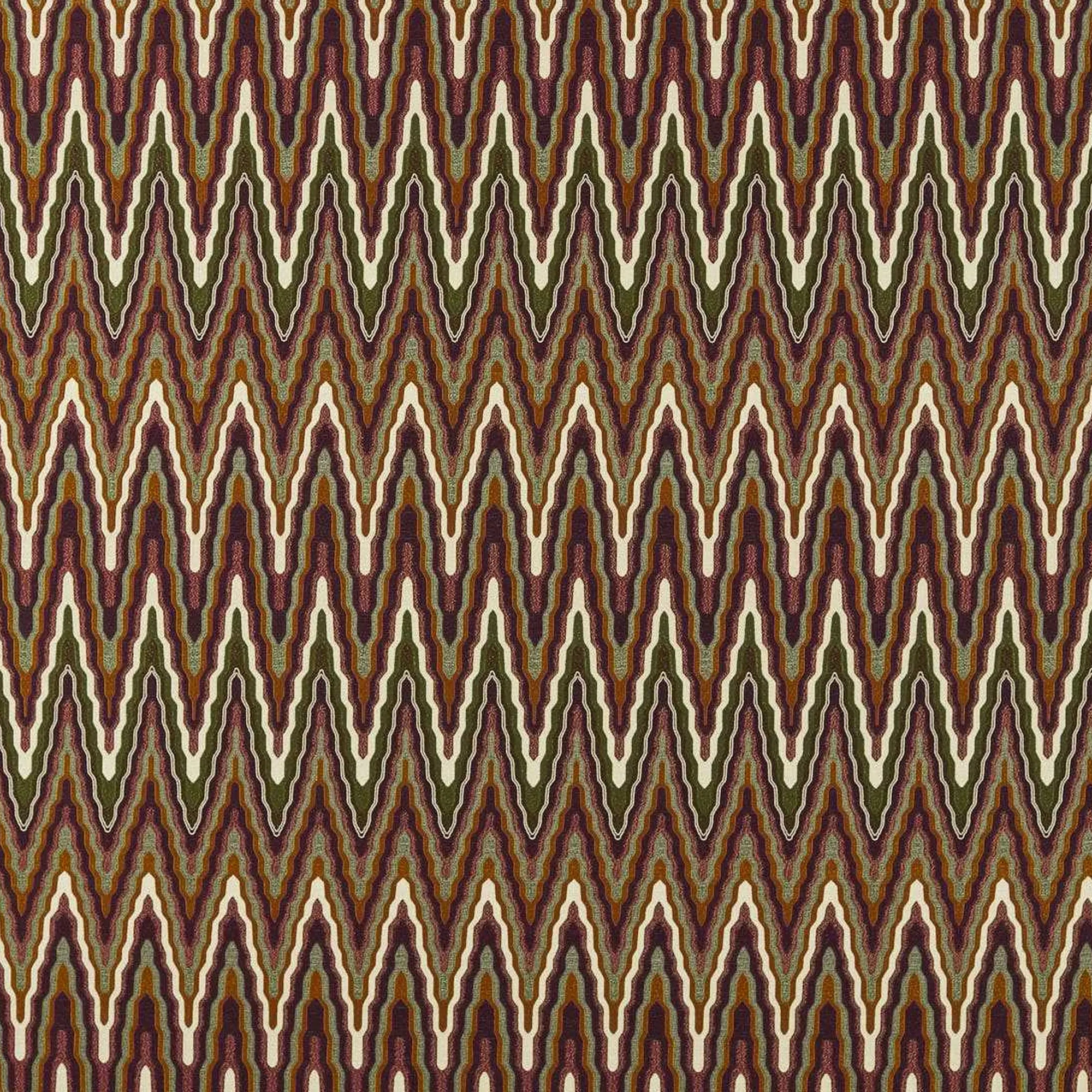 A design taken from the archive, Elota has been woven on a jacquard loom. This rich ikat design originates from the family of flame stitch patterns, notable for its zig-zag. Fusing history and modern textile engineering, Elota is a bold and eye-catching design. Floating yarns and a soft sheen in two rich colourways add depth to this special design.
