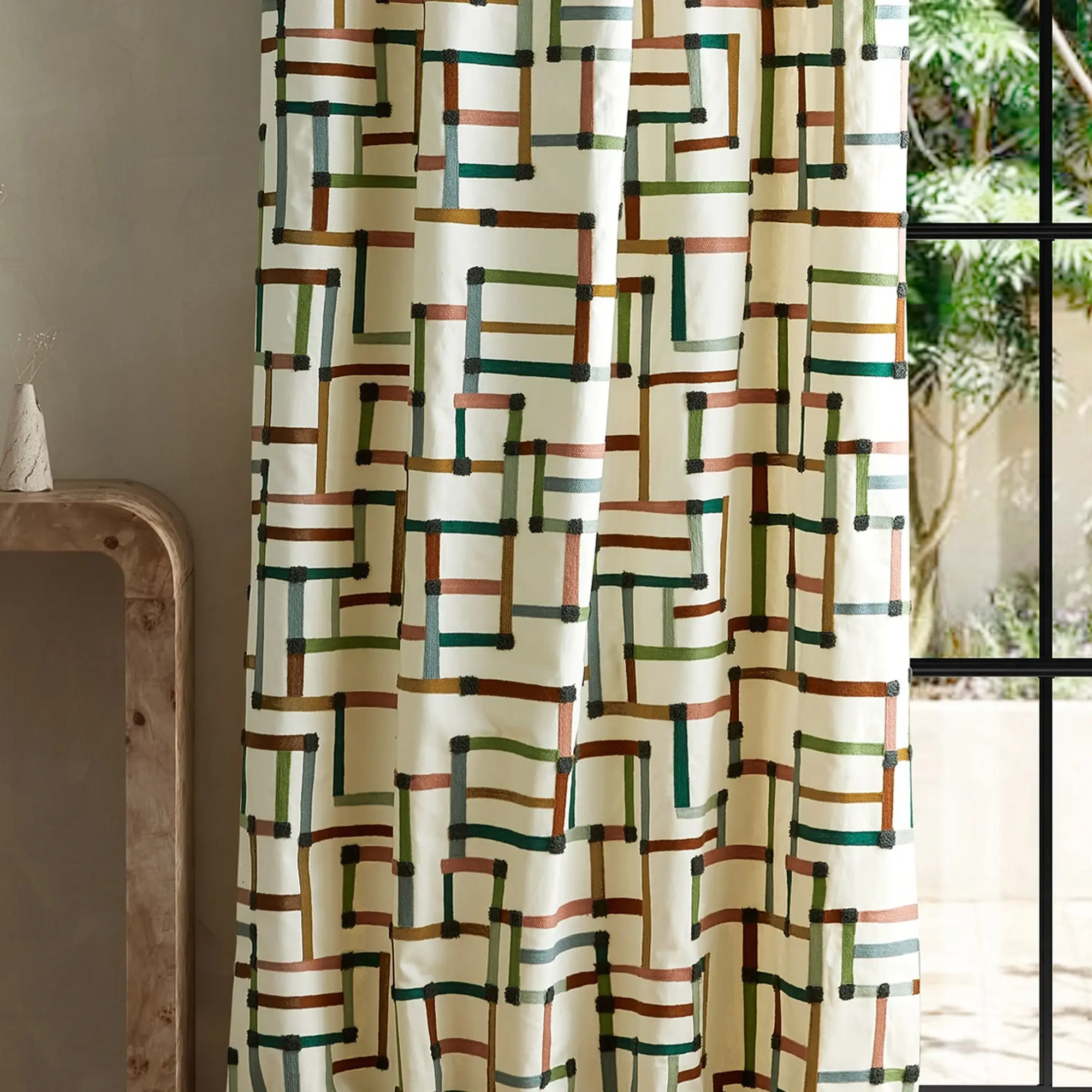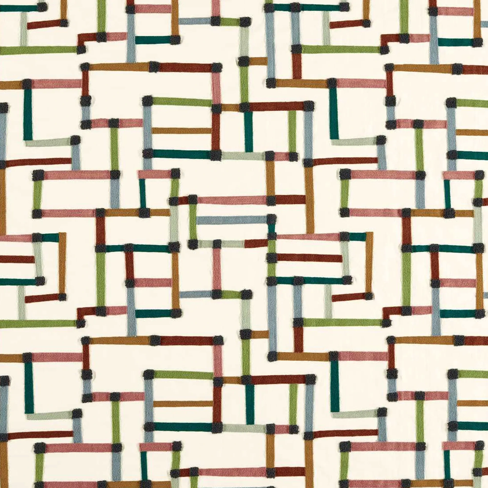 Lineas is a crewel stitch on a 100% cotton ground. The embellished, textural style creates an all-over geometric pattern, which embraces a weave in its maze-like design to include an array of colours on a simple ground.