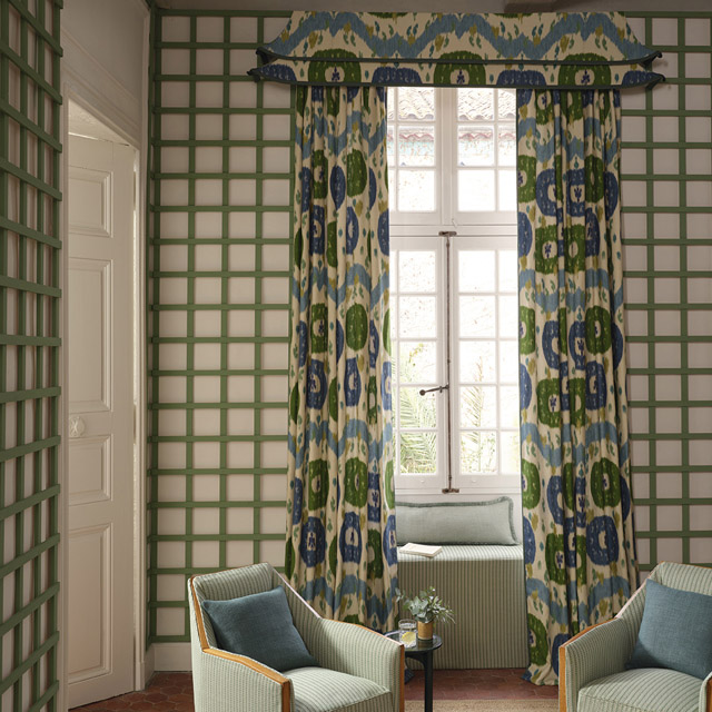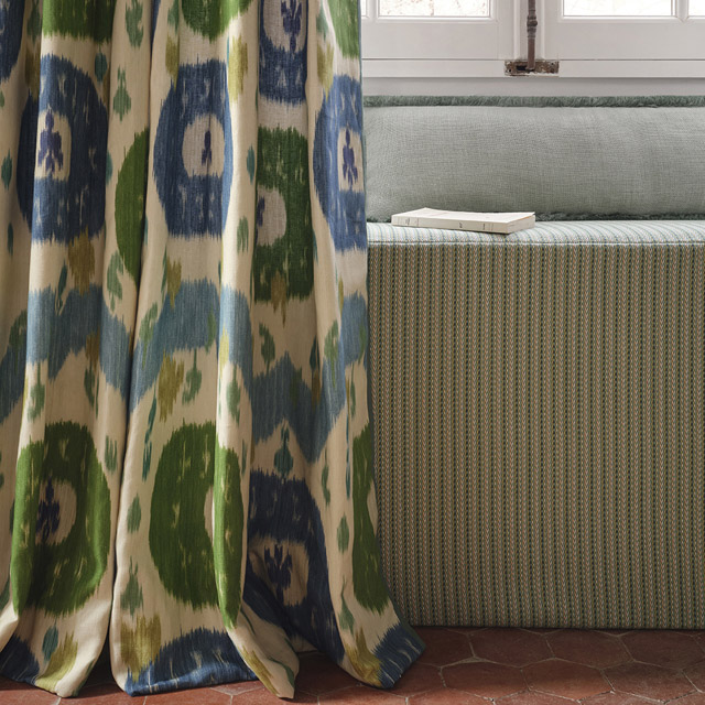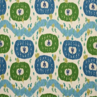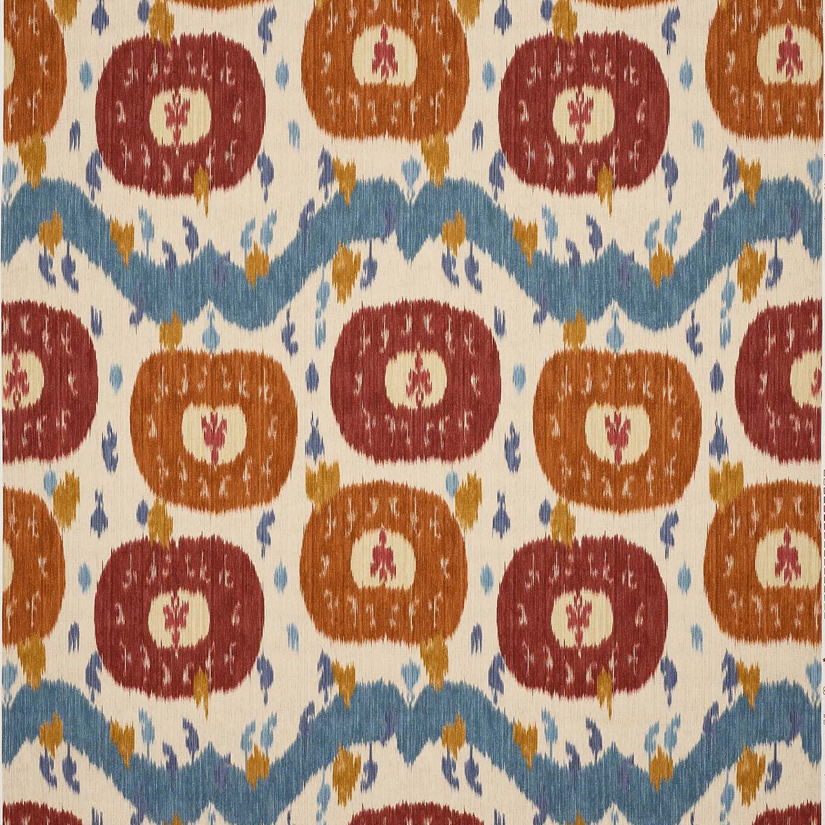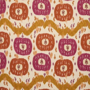 Traditional Uzbek weaving techniques inform this striking printed design, presenting a contemporary reinterpretation of a timeless ikat motif. Bold and joyful, its vibrant palette and grand scale captivate the eye.
