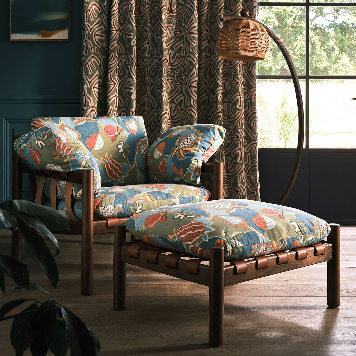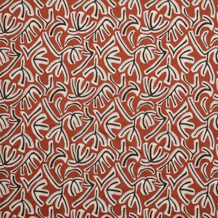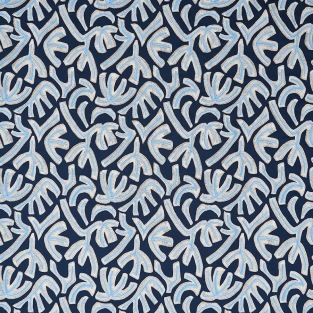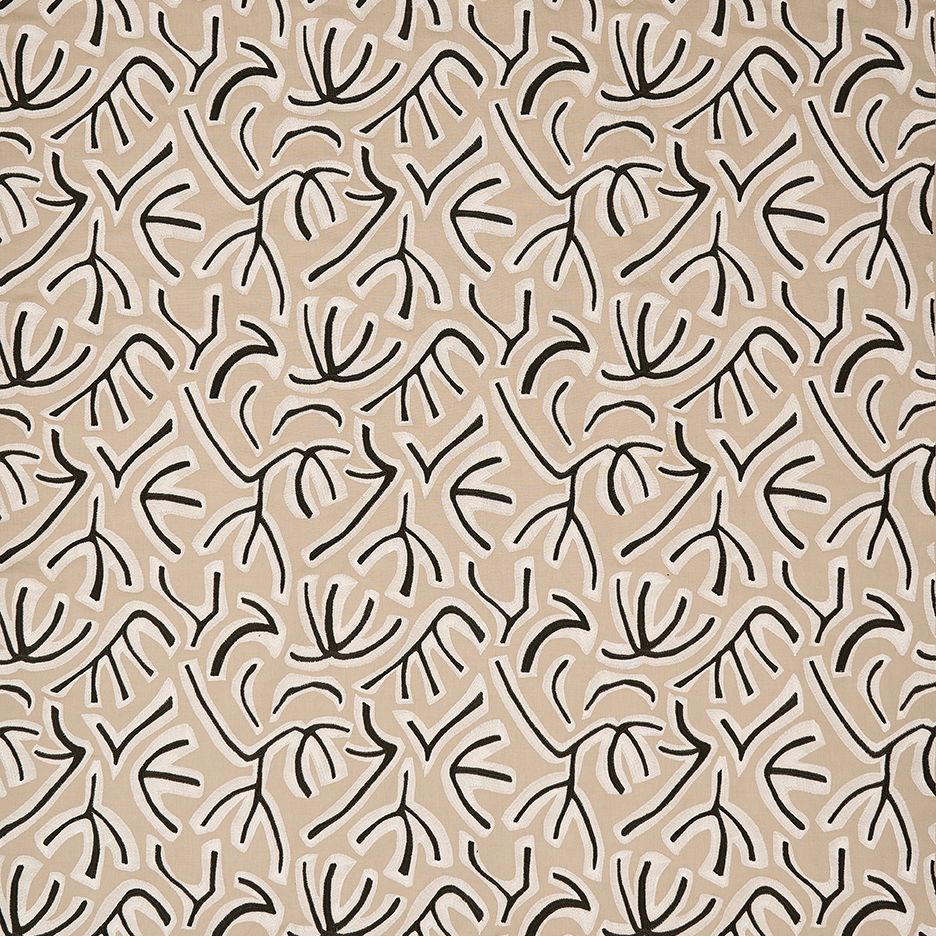 Embroidered, multi-directional abstract shapes on coloured grounds.