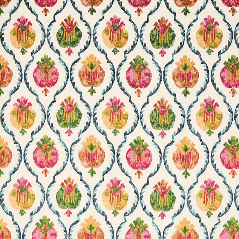An embroidered ogee trellis framing stylised pomegranates in jewel-like colours.