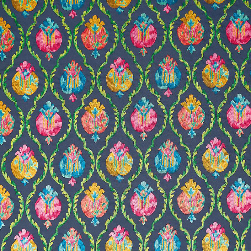 An embroidered ogee trellis framing stylised pomegranates in jewel-like colours.