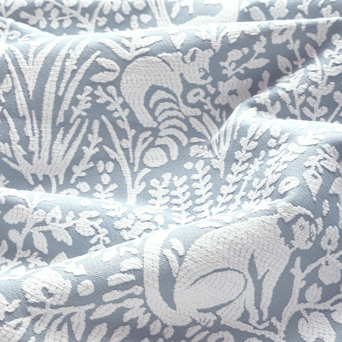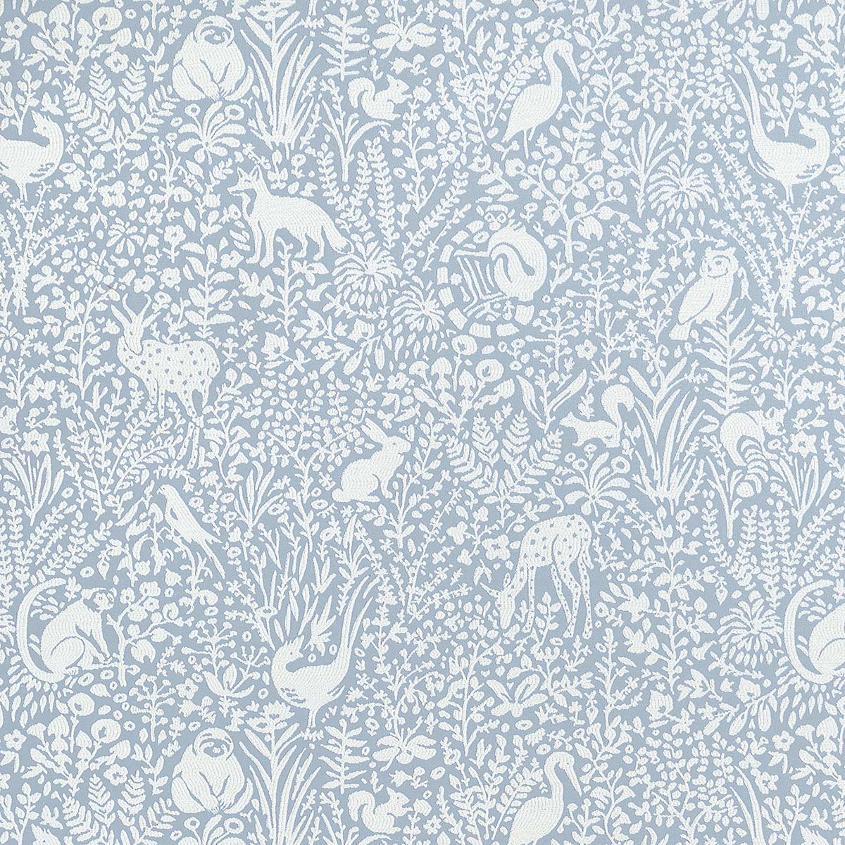 The whimsical spirit animals of Kindred hide among botanical forms to create a balanced relationship between figure and ground. The soft chenille contrasts with the crisp color field in full-bodied pastels, creating a sophisticated play of surface interest.