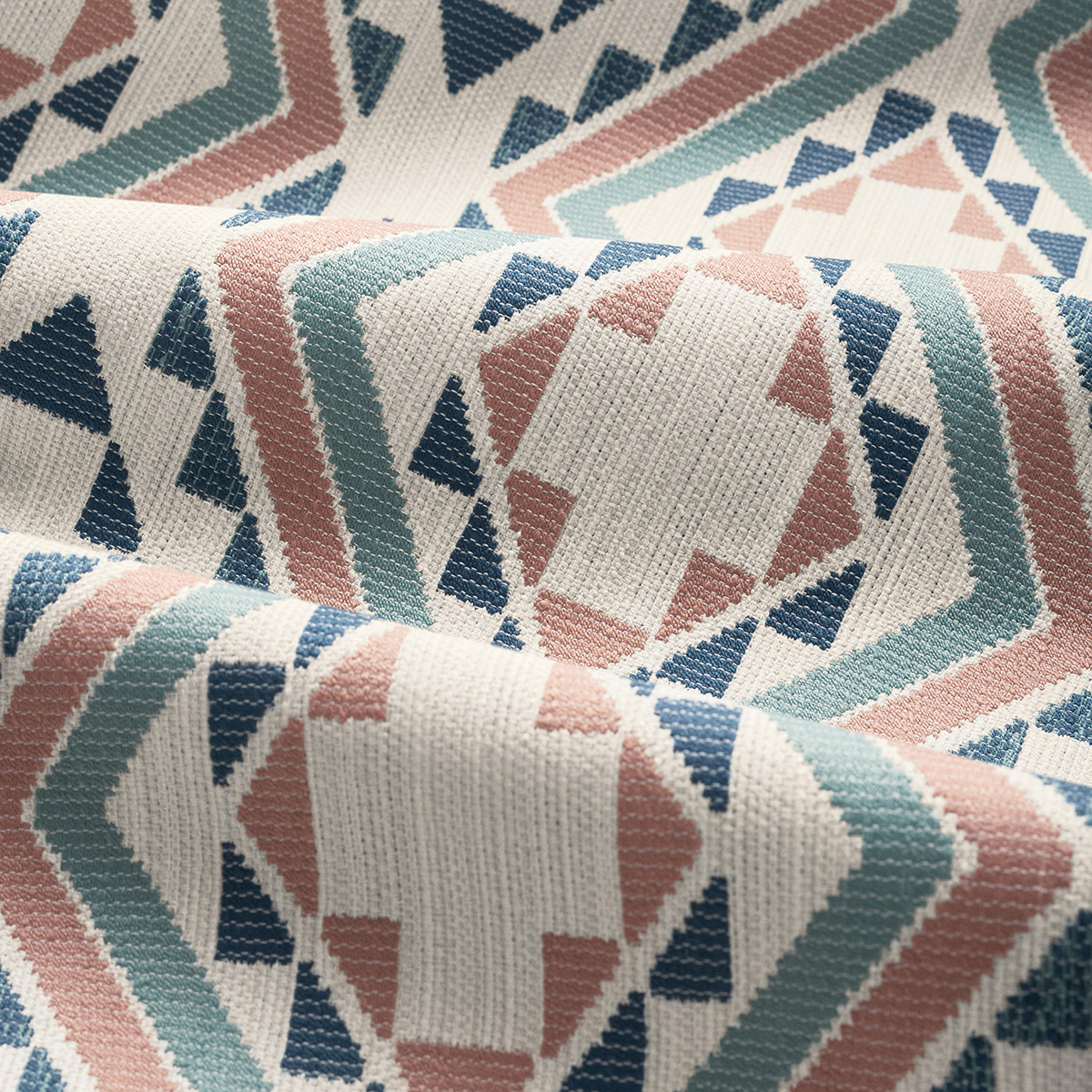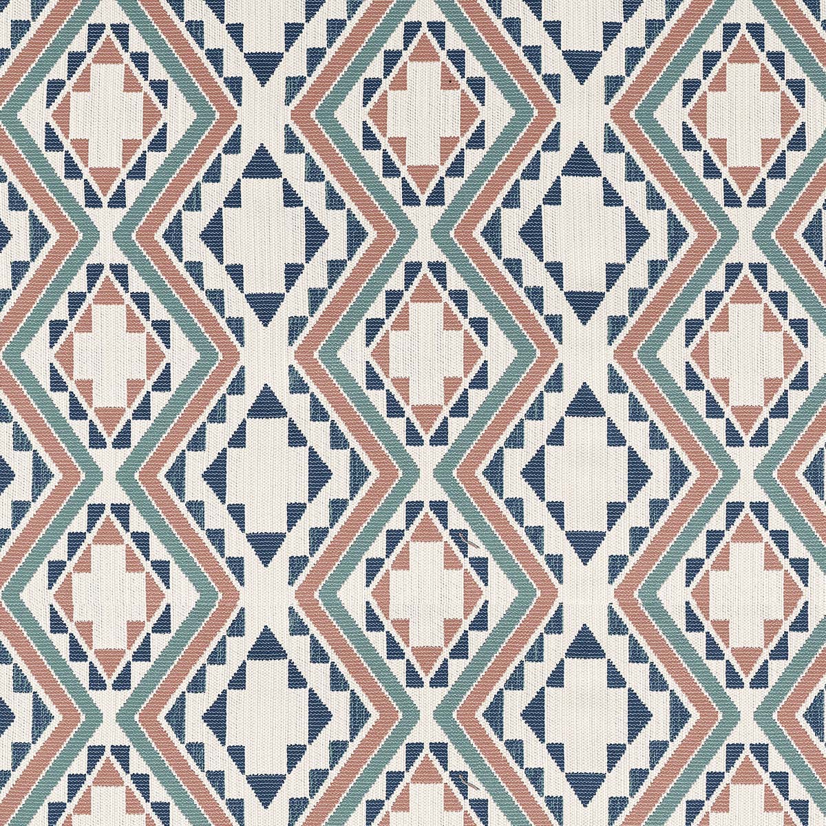 Sagamore is a globally inspired pattern derived from a graphic document crafted in raffia. Like a chief among native peoples, it’s bold geometry creates a strong, colorful presence on a rugged, chunky ground. Available in four distinct palettes on crisp white or soft flax.
