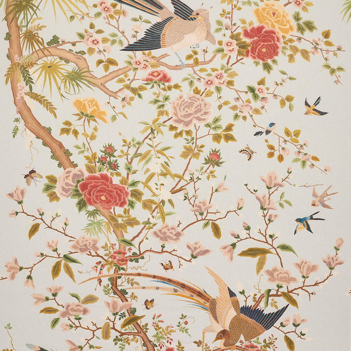 This fabric design evolves from the Belmont Wallcovering, reimagined as a long, flowing trail. Bold in scale, the chinoiserie-inspired motif features exotic birds, bamboo, and blossoming florals. Developed from an original embroidered silk in the Colefax and Fowler archives, the pattern captures exceptional detail. Printed on the Hector base, it evokes the artistry of hand-painted panels, while preserving the grandeur and authenticity of true Chinoiserie design