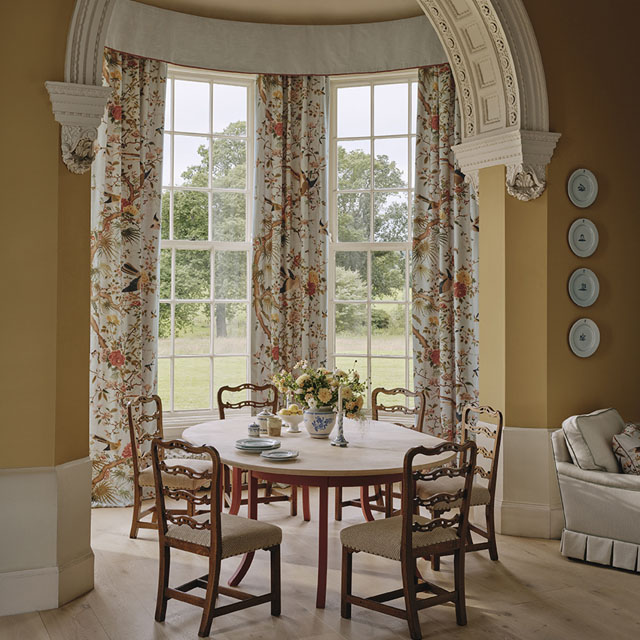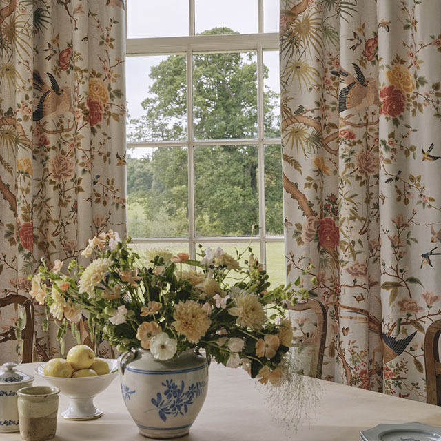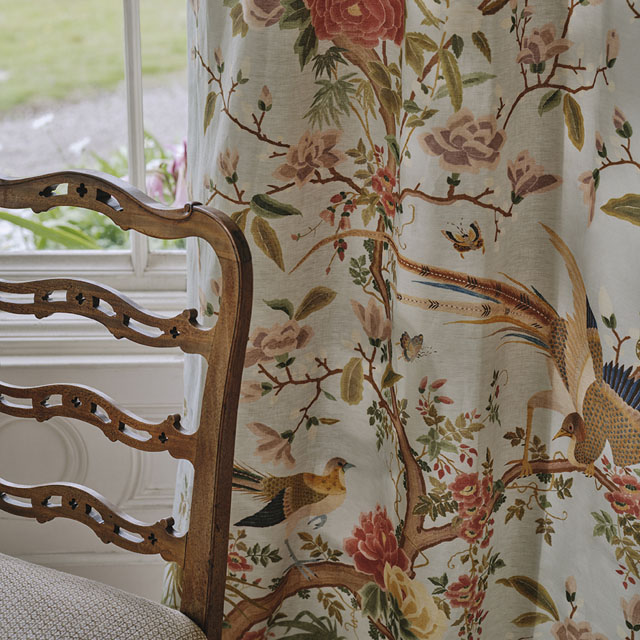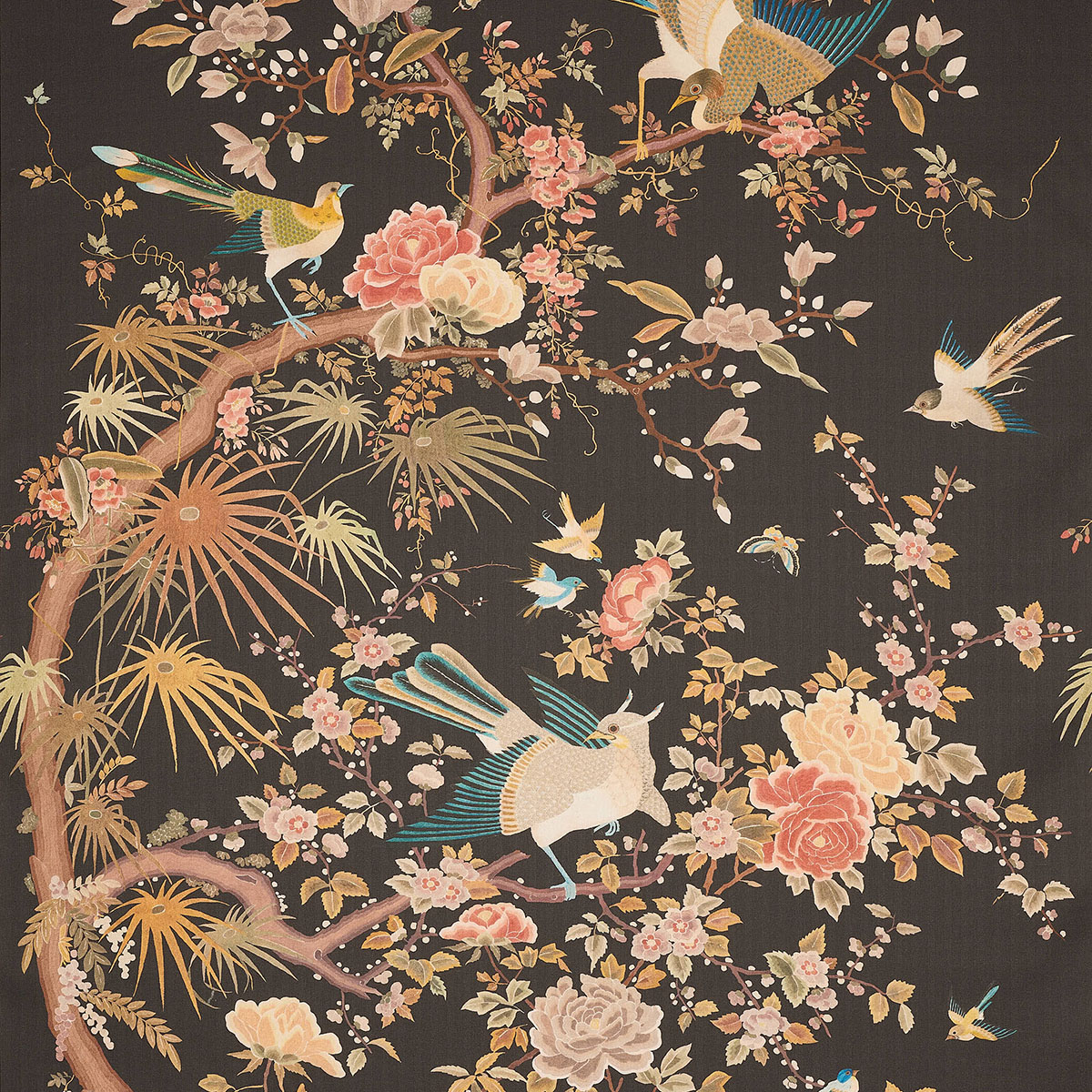 This fabric design evolves from the Belmont Wallcovering, reimagined as a long, flowing trail. Bold in scale, the chinoiserie-inspired motif features exotic birds, bamboo, and blossoming florals. Developed from an original embroidered silk in the Colefax and Fowler archives, the pattern captures exceptional detail. Printed on the Hector base, it evokes the artistry of hand-painted panels, while preserving the grandeur and authenticity of true Chinoiserie design