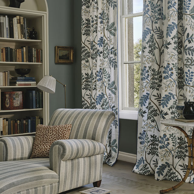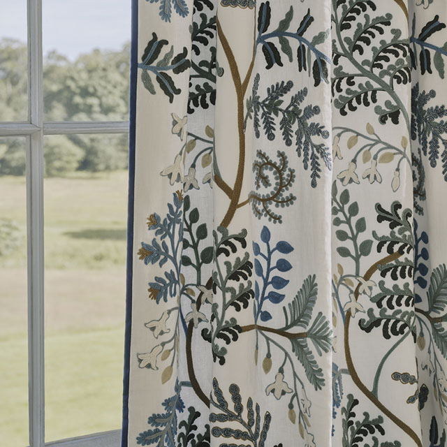 Inspired by botanical forms, Ellerdine makes a striking statement with a rhythmic pattern of fern fronds and leaves embroidered on linen. Its chain-stitched leaves create graphic simplicity, while corded white flowers add an elegant touch. Tonal twisted corded details bring depth and texture, enhancing the fresh, distinctive character of this botanical design.