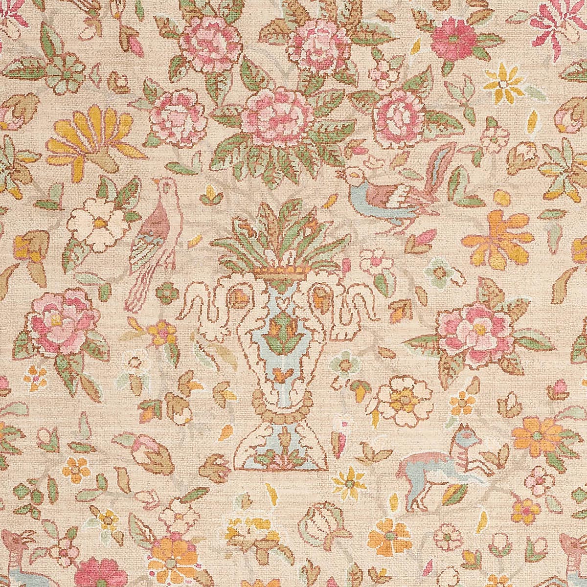leury is a richly textured and distinctive print, inspired by a 20th-century carpet fragment in the Persian tradition. A joyful medley of stylised birds, animals, and flowers lends the design a whimsical, enchanting character. The subtle tonal variations of the original are masterfully reimagined through layered colour, evoking the depth and texture of antique carpet pile with remarkable skill.