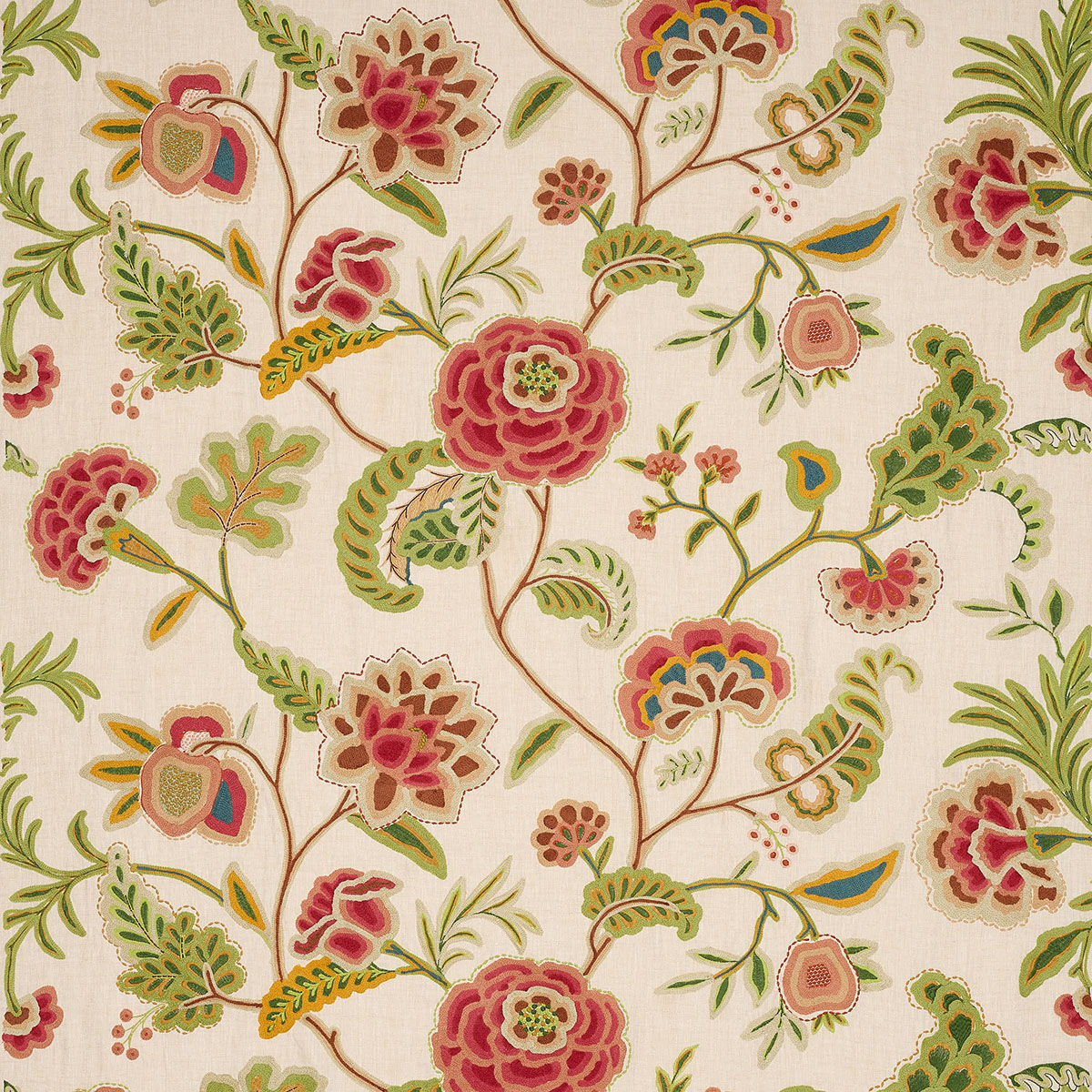 Inspired by a 17th-century English crewelwork bedhanging, this stunning signature design showcases a rich blend of embroidery techniques. Francine embraces the Jacobean style, featuring stylised leaf and flower motifs that celebrate nature’s beauty. Its handcrafted appeal comes from two distinct embroidery layers: a fine yarn base topped with woolly yarn worked by hand in chain stitch. This layering creates remarkable depth, with varied colours and textures that enrich the design. A luxurious, decorative embroidery that honours our British heritage.