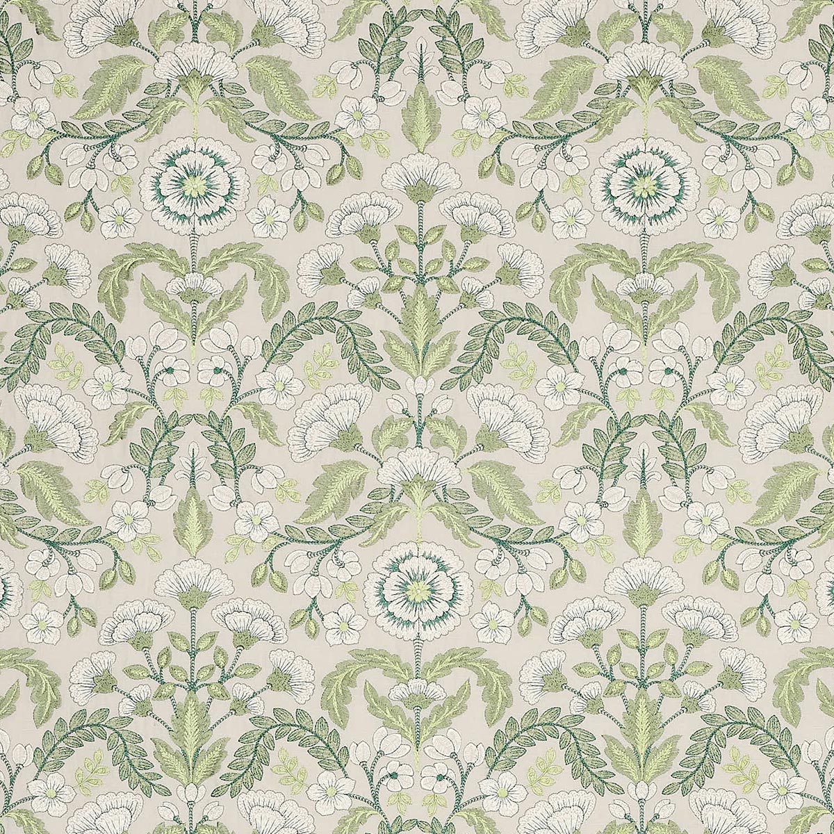 Mirabelle is a delicate embroidery inspired by the intricate, richly patterned surfaces of 17th-century brocaded damasks. Its all-over floral and leaf stitchwork features white flowers outlined with fine, precise stitching, while a mirrored repeat adds subtle formality to this graceful design.