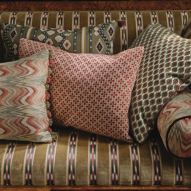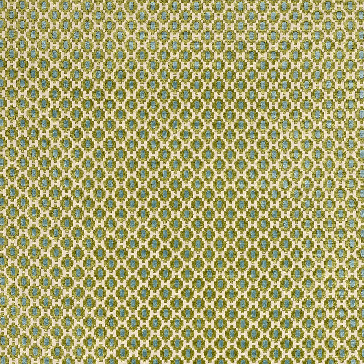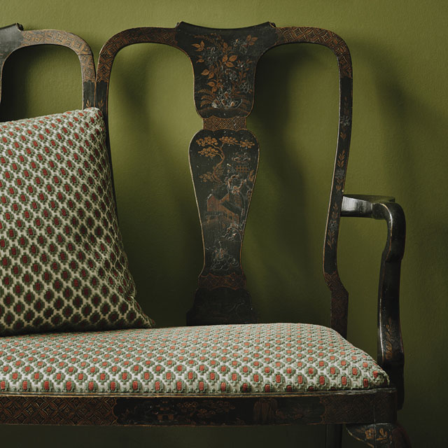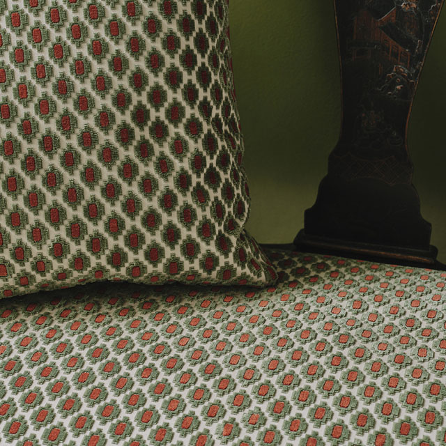 A stylish small-scale diamond velvet inspired by the classical detailing of antique eighteenth century pieces. The key to the appeal of this neat crenelated motif lies in its fine detailing, the pile is a beautifully soft cotton, and the ground is a crisp cotton satin. Delicate lines of uncut loop accentuate the effect, and the two-colour pile adds another appealing twist.