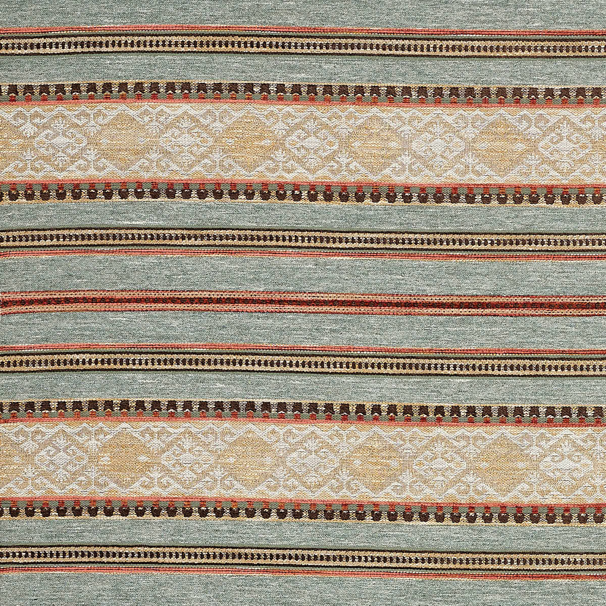 Inspired by antique kilims, this richly patterned woven stripe combines a variety of contrasting textured yarns to create dynamic surface interest. The muted patterned stripe, derived from one of our trims, is complemented by narrower bands featuring intricate motifs and chenille detailing. A marled yarn is used for the ground, adding depth and enhancing the layered, artisanal character of the design.