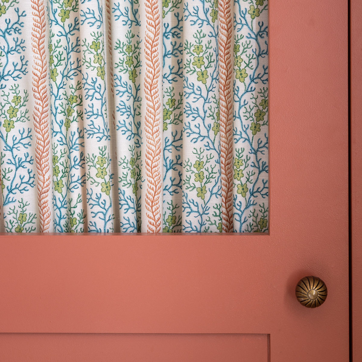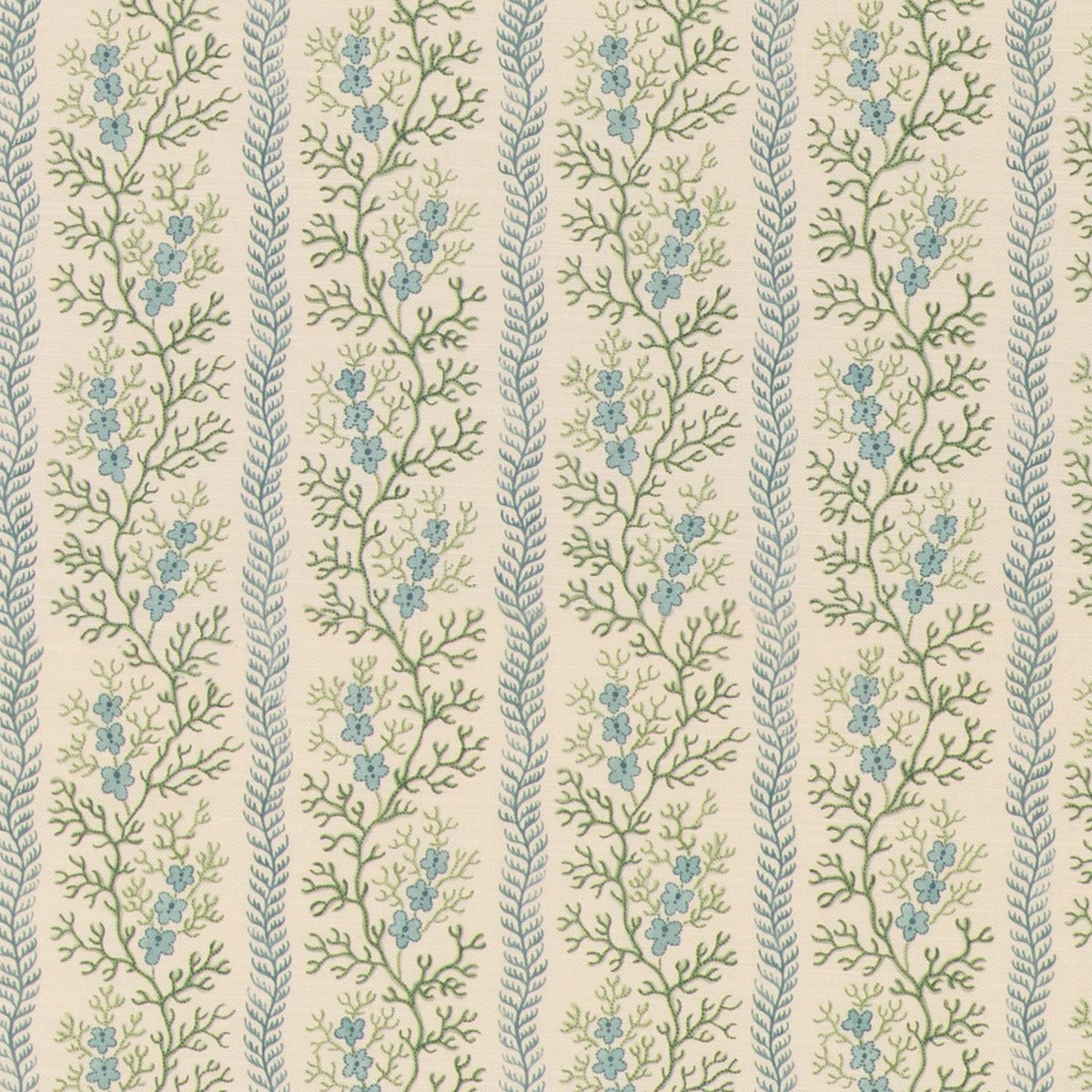 Charmingly informal just like its namesake, ‘Symington’ features a delicate leafy coral stripe adorned with pretty miniature flowers. Taken from a small watercolour design which is dated from 1760-1790, the design would have been used to print onto lightweight cotton or muslin for ladies clothes.