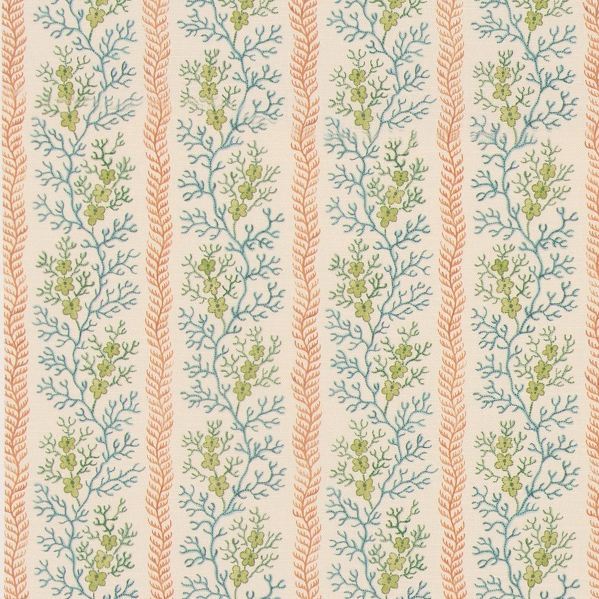 Charmingly informal just like its namesake, ‘Symington’ features a delicate leafy coral stripe adorned with pretty miniature flowers. Taken from a small watercolour design which is dated from 1760-1790, the design would have been used to print onto lightweight cotton or muslin for ladies clothes.