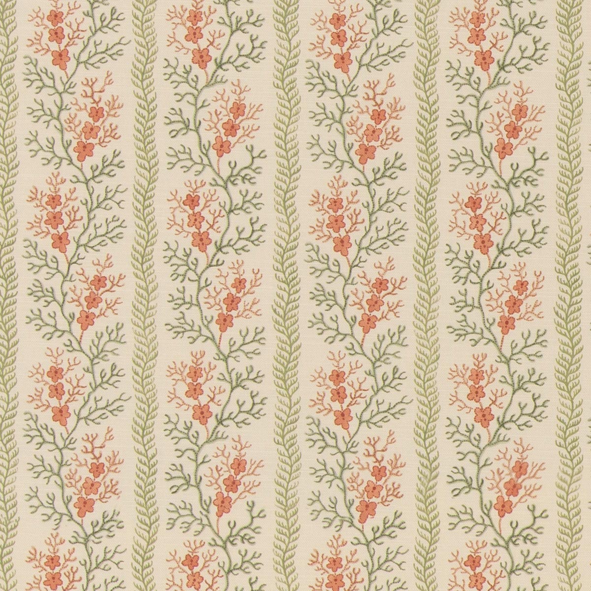 Charmingly informal just like its namesake, ‘Symington’ features a delicate leafy coral stripe adorned with pretty miniature flowers. Taken from a small watercolour design which is dated from 1760-1790, the design would have been used to print onto lightweight cotton or muslin for ladies clothes.