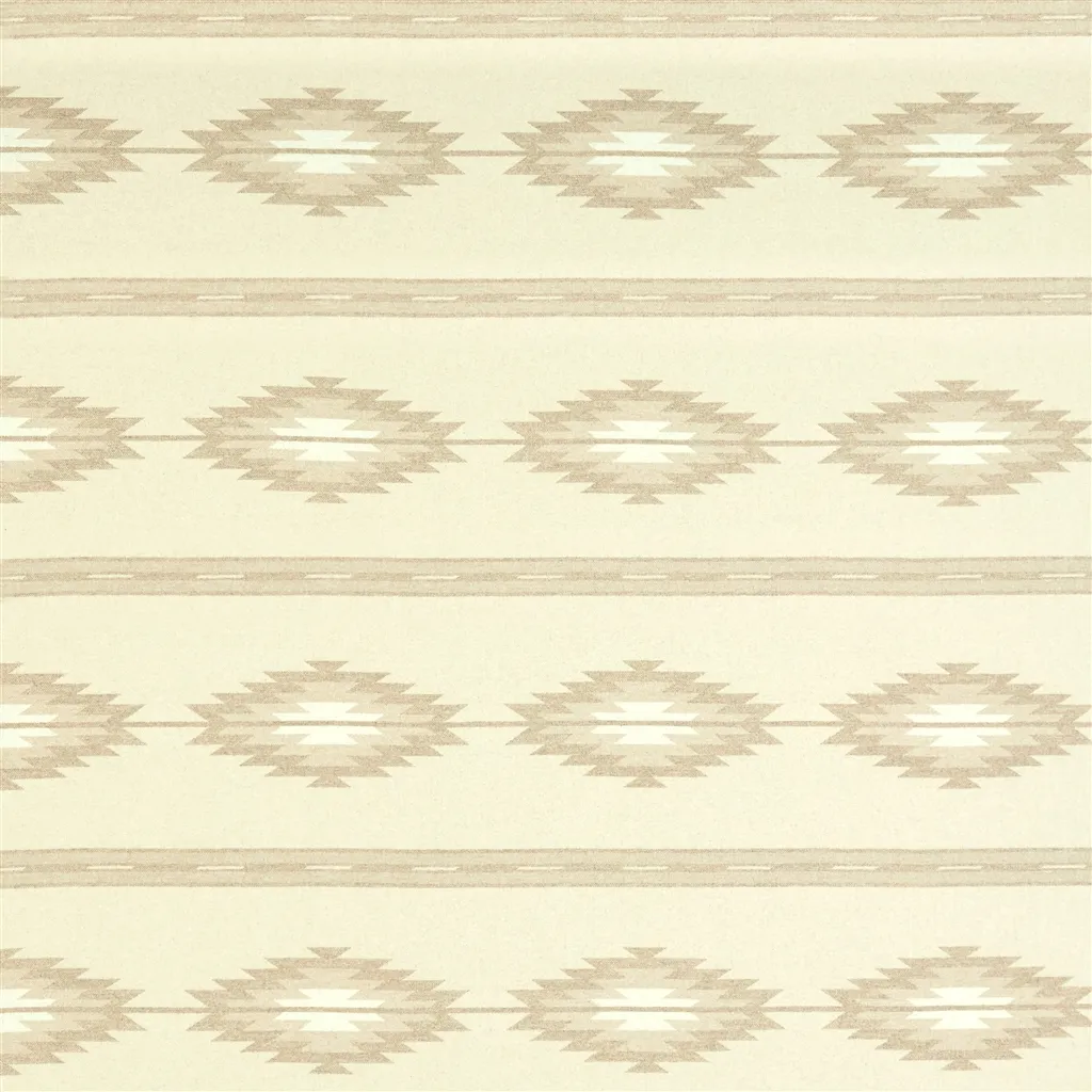 Named after a beloved horse on the Glasses' family ranch and inspired by one of Tyler's early weavings used as Peppy's saddle blanket. Stepped diamond motifs, or butterfly diamonds, create a bold horizontal stripe in cream and natural spanning across the fabric. Suitable for upholstery, drapery and cushions.