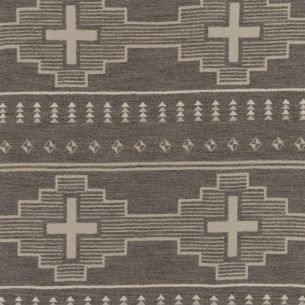 Inspired by the natural landscape on Navajo Nation, Standing Crosses features four-directional crosses, signifying the Earth's four directions in Navajo tradition, framed by a stepped motif filled with fine stripes inspired by rock striations. A row of triangles represents elements within the natural landscape. Nodding to the natural, undyed wools favoured by the Glasses siblings, this fabric features a heathered, heavier-weighted yarn and offers an organic feel. Suitable for upholstery.