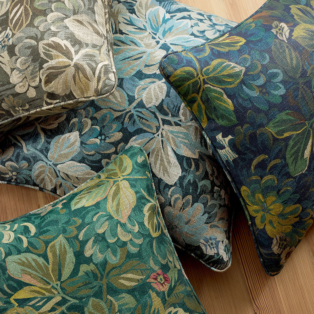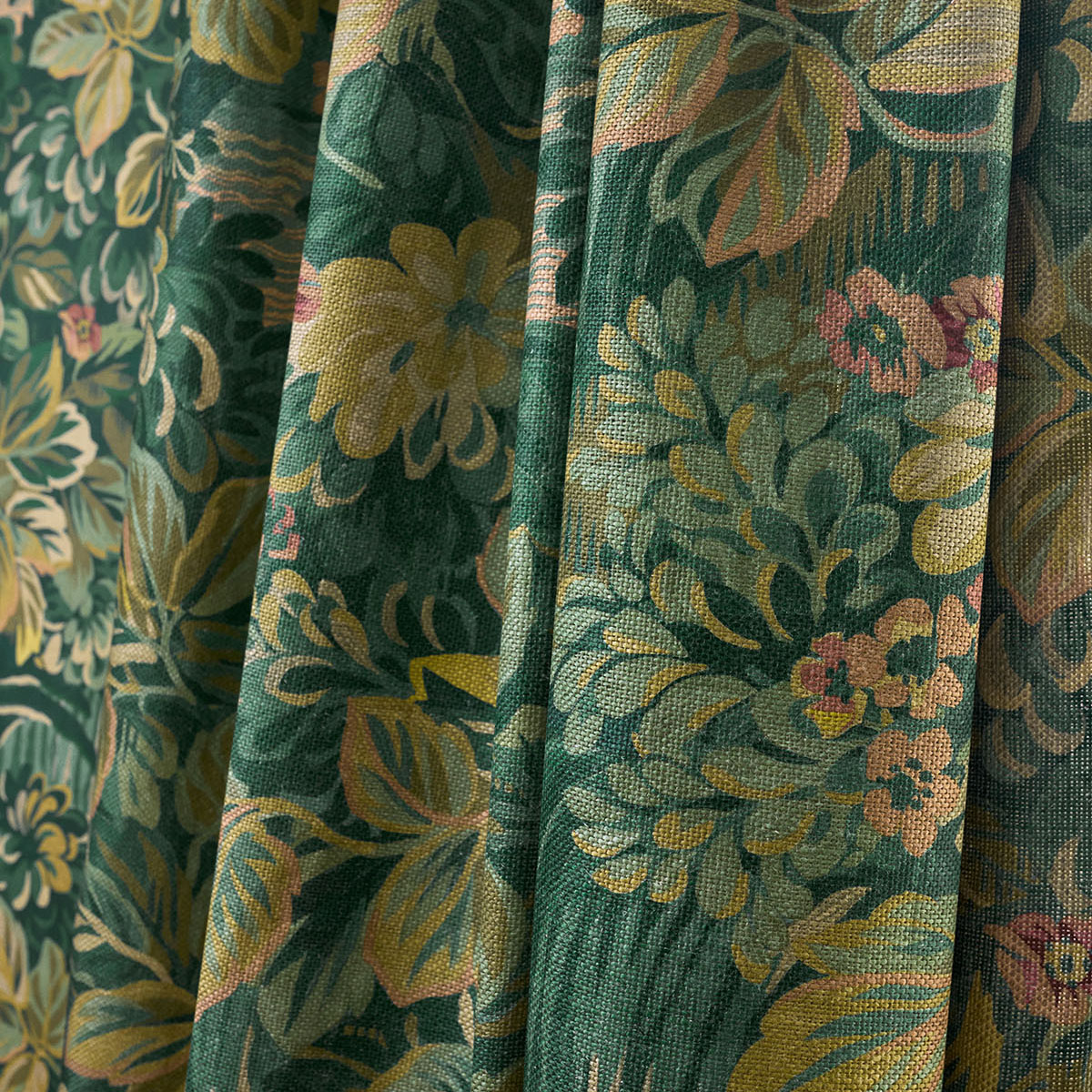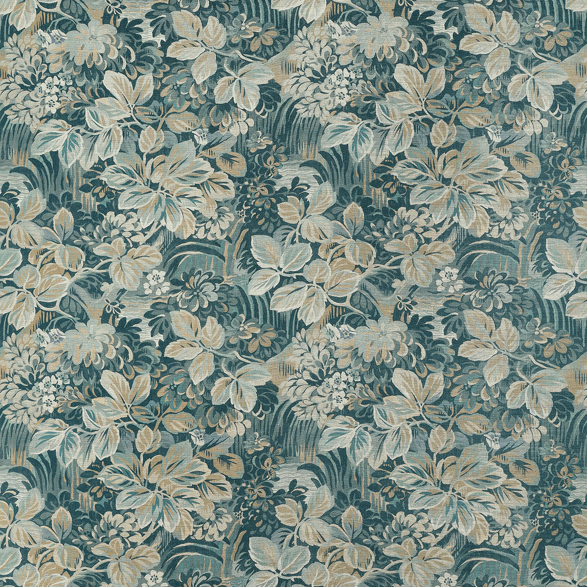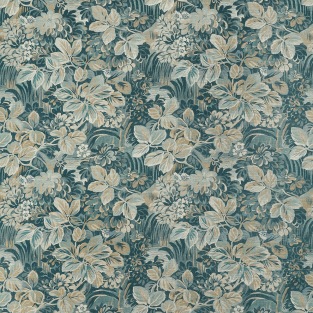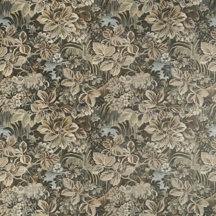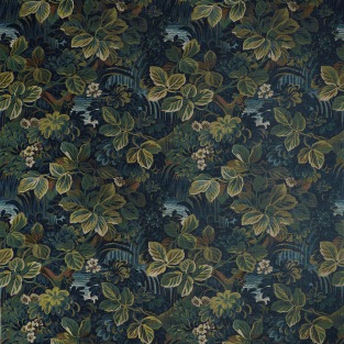 Night Garden resembles a rich tapestry with its dense, full coverage design in dark and moody tones. Occasional breaks in the foliage reveal moonlit ripples of water. The linen fabric adds an elegant softness to the design, and the wallcovering is printed to maintain that same texture.