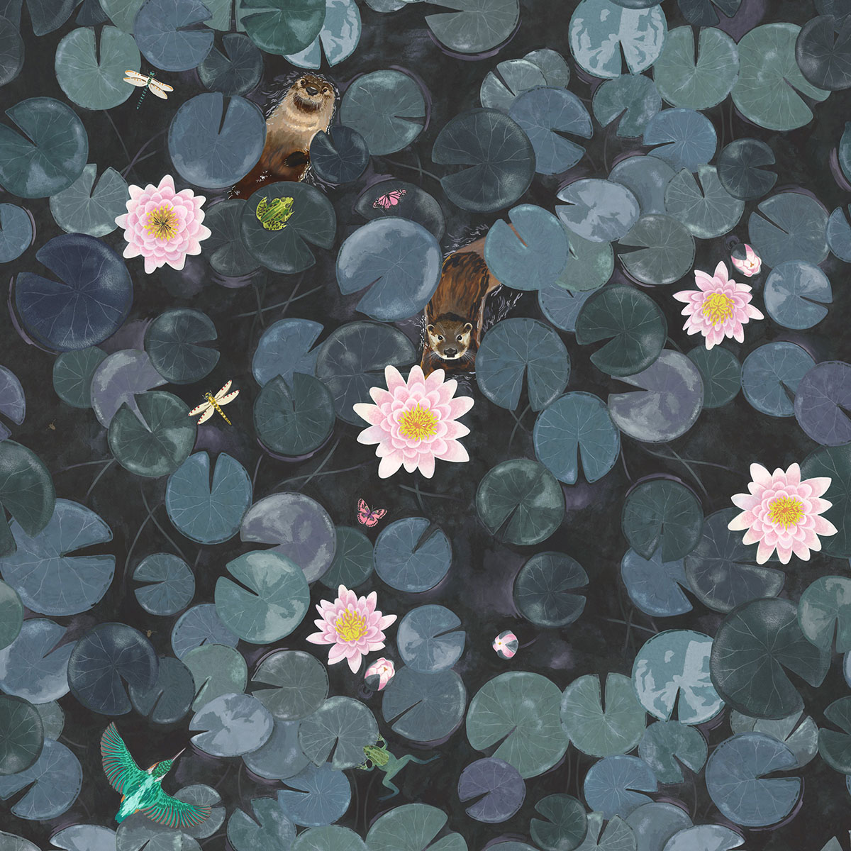 Within the Stackpole Estate in the south-west corner of Wales, nature thrives in over five square miles of protected coastline, farmland, forestry and lakes. Besides sightings of bats in the woodland and dolphins in the sea, one of the visitor highlights are the wild otters which can sometimes be spotted amongst the lily pads within the estate’s 100 acres of lakes. The ‘Lily Pads’ design showcases graphic lily pads interspersed with waterlilies. Hidden in their midst, dragonflies, otters, kingfishers, butterflies and tiny water boatmen reveal themselves in this expansive celebration of native British flora and fauna.