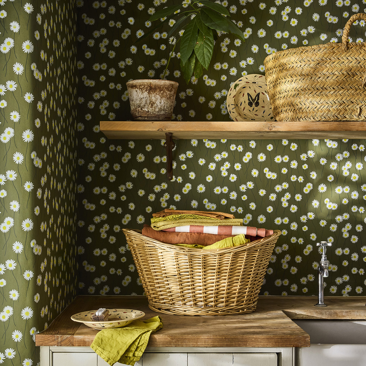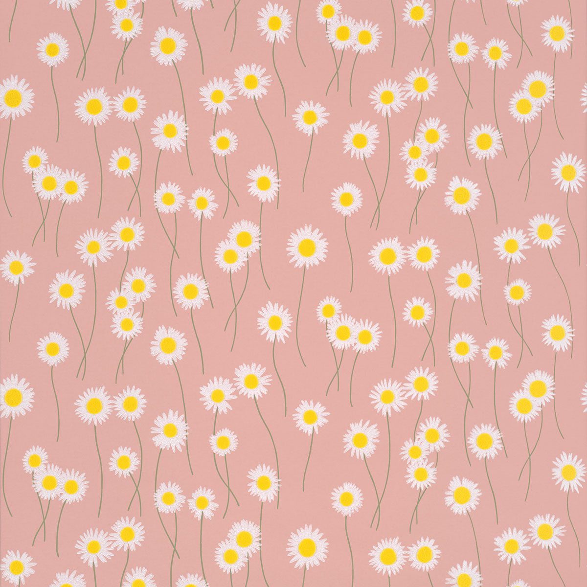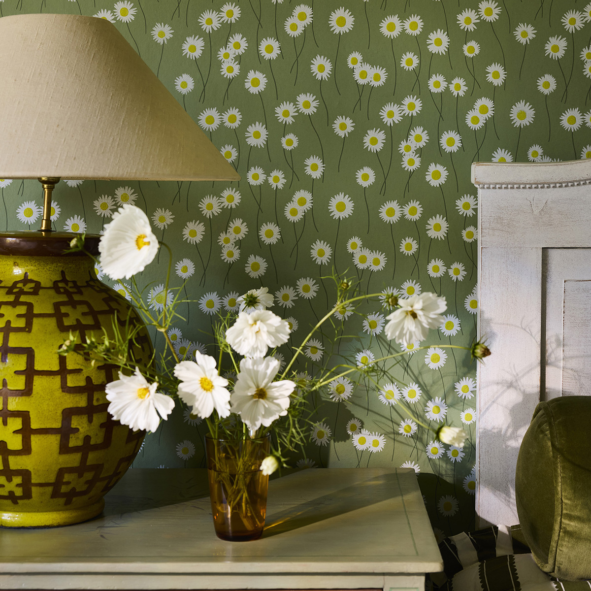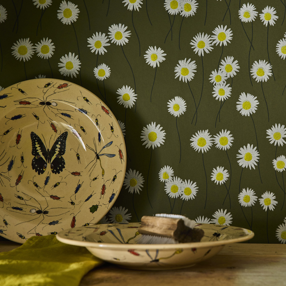 The unrivalled simplicity of the daisy flower has inspired surface design for centuries; from decorative embroidery to ceramics, and fashion items to wallpaper. Taking its title from an informal name for the ox-eye daisy, which is known for reflecting moonlight alongside country roads and paths at night, this design features bright yellow flocked centres on daisies with interlocking stems; a much simpler interpretation than the late-19th-century wallpaper, found at Oxburgh Hall, that inspired it.