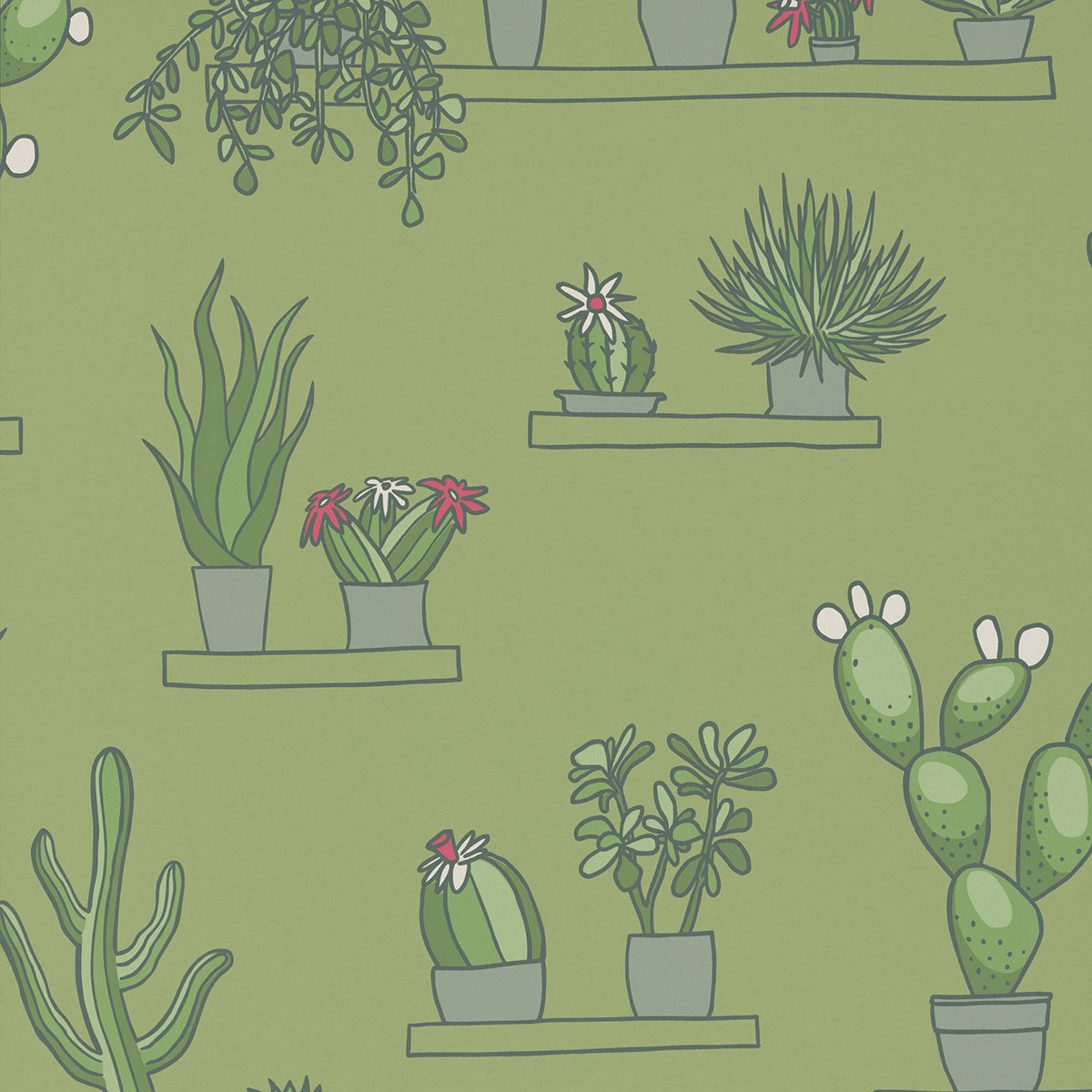 Featuring charmingly illustrated sculptural succulents and flowering cacti displayed on shelves, the ‘Mr Straw’s Greenhouse’ wallpaper design is offered in three subtle tonal colourways of Light Gold, Garden and Air Force Blue and three bolder contrast designs where each specimen is highlighted in bold green against backgrounds of neutral Slaked Lime and bold Green Verditer and Mambo.
